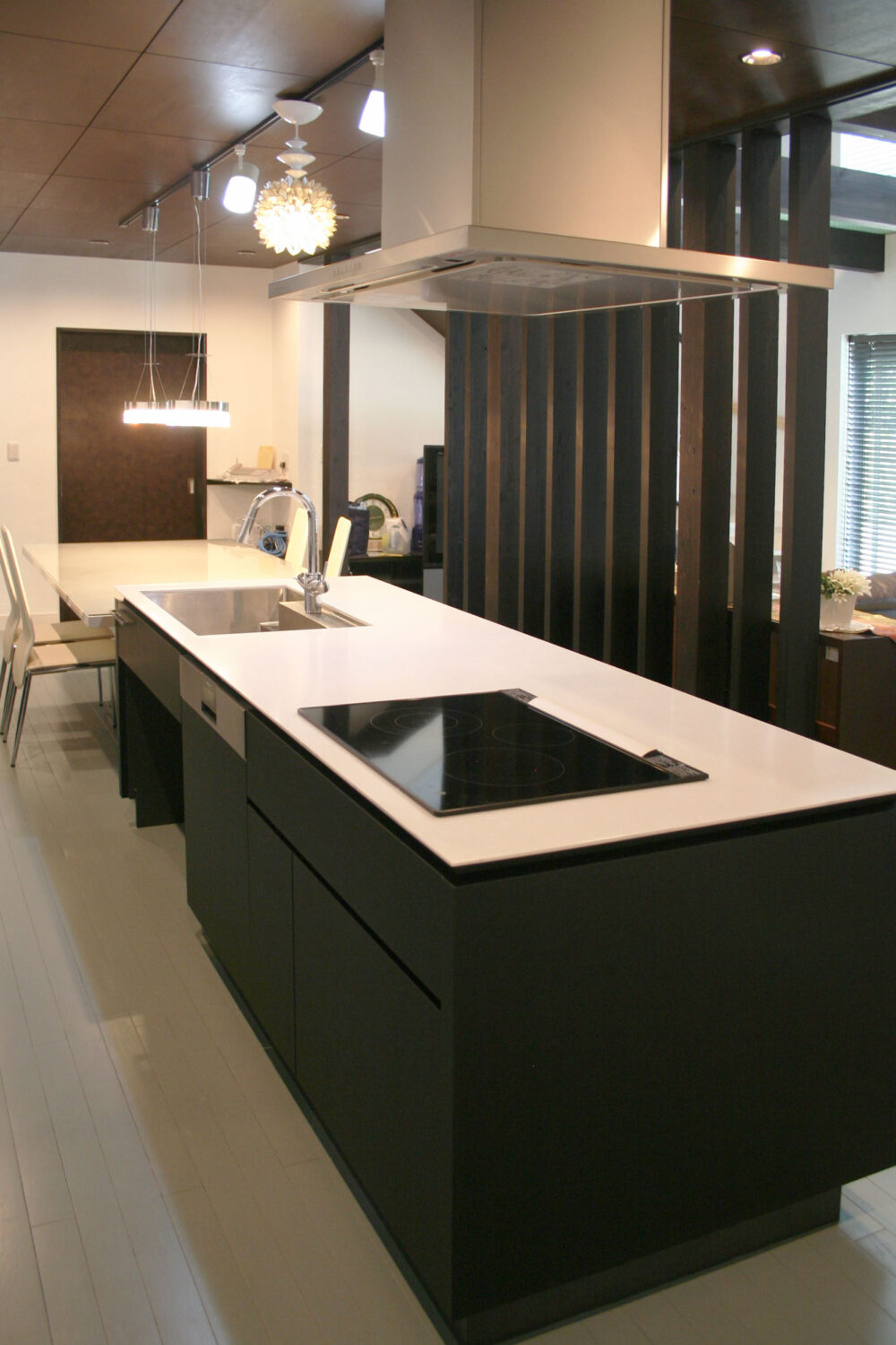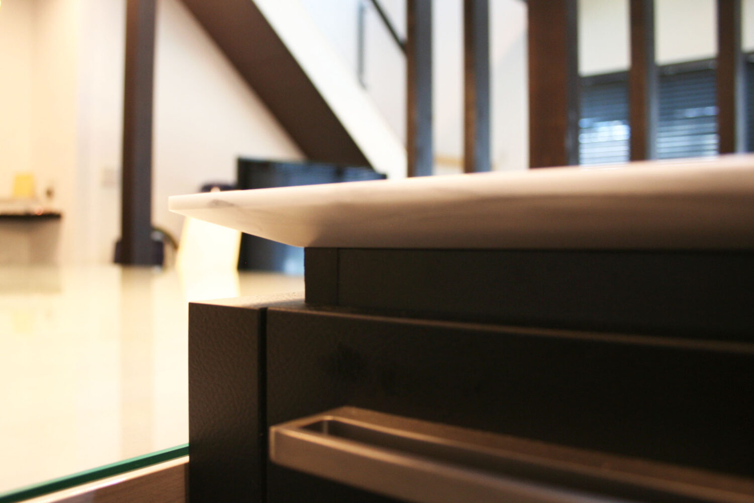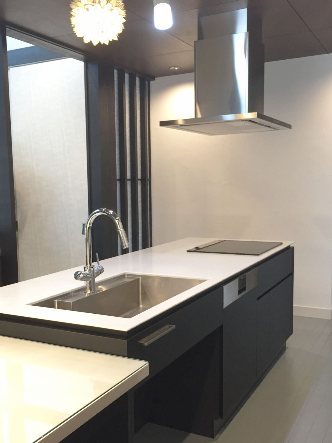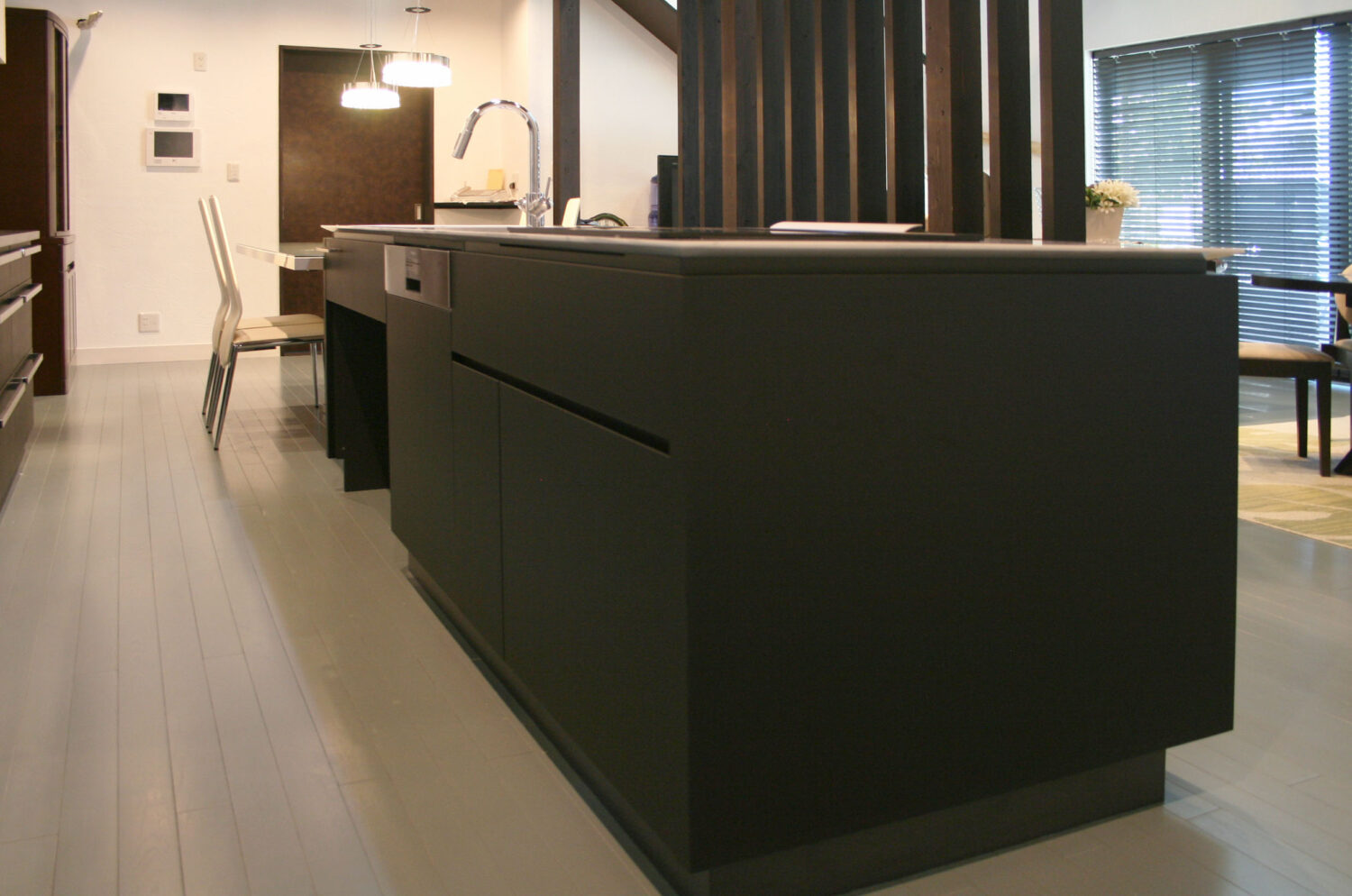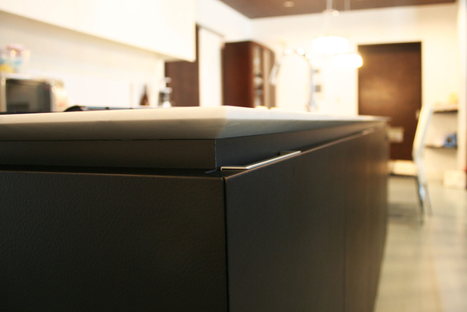 ブラックレザーのハードなテクスチャーにワークトップカウンター淡いグレーの模様デュポンコーリアンのシーフォームでまとめました。