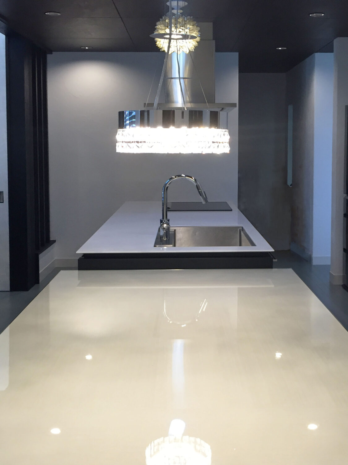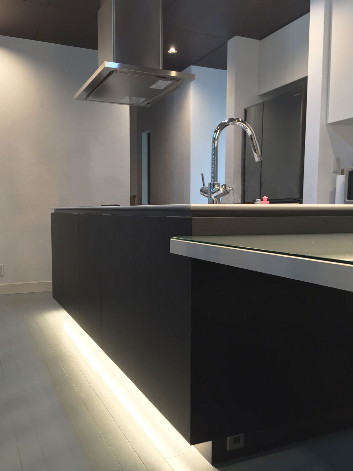 ワークトップカウンターはテーパー形状に、扉とサイドパネルを留め加工にしてエッジを際立たせ、足元に照明も埋め込んでいます。