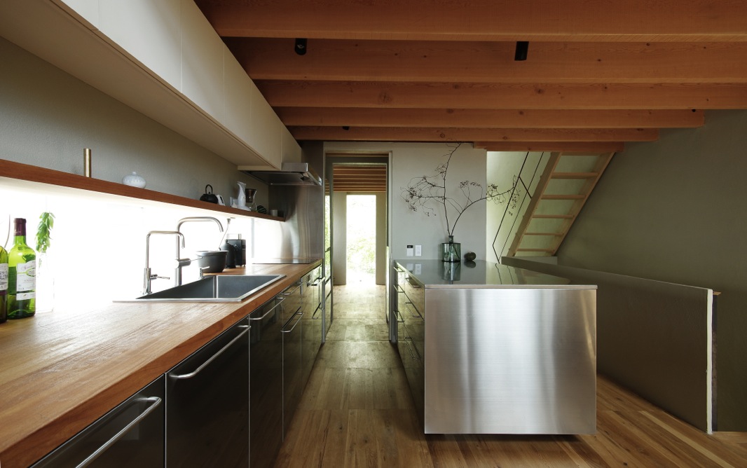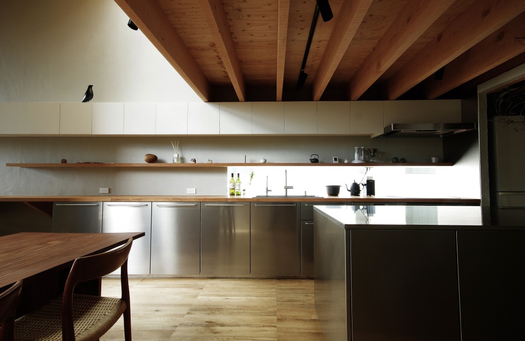 キッチンはスタディーコーナーへと続き、リビングのベンチとなり続いて行く。