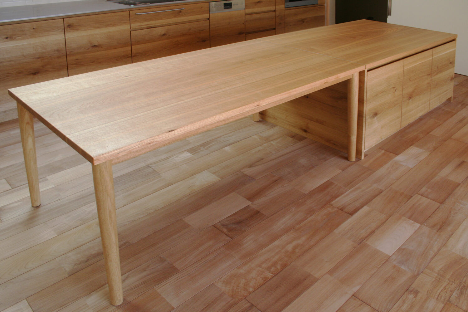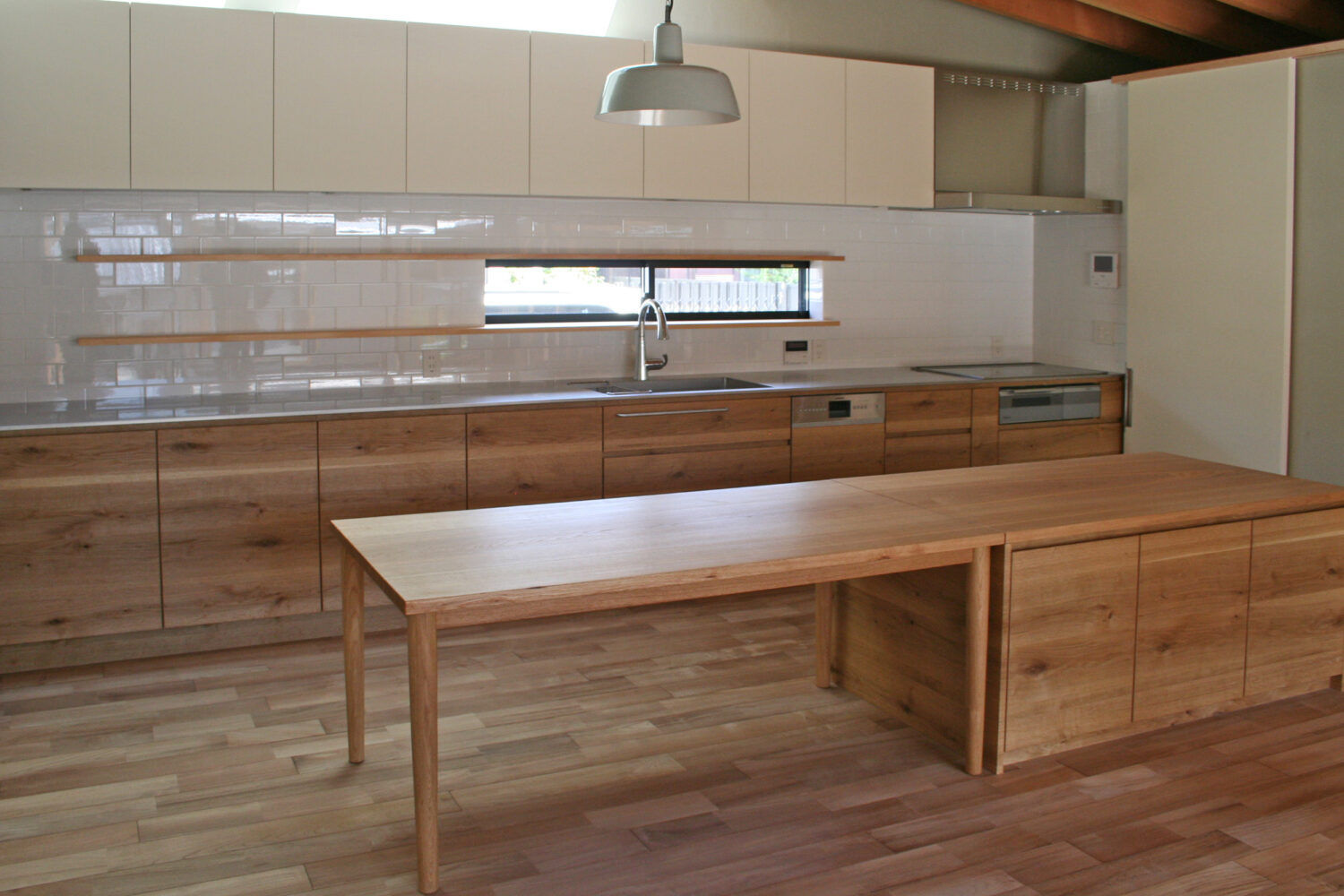 アイランドの作業台と高さをそろえたダイニングテーブルはオーダーにて製作。