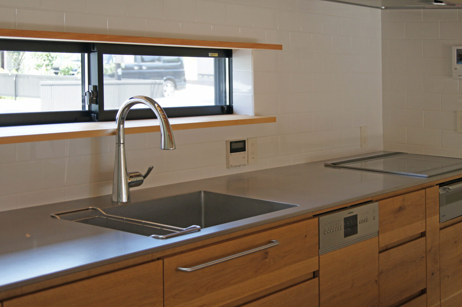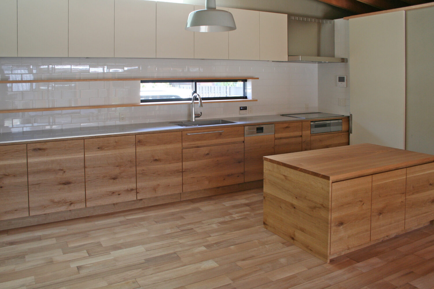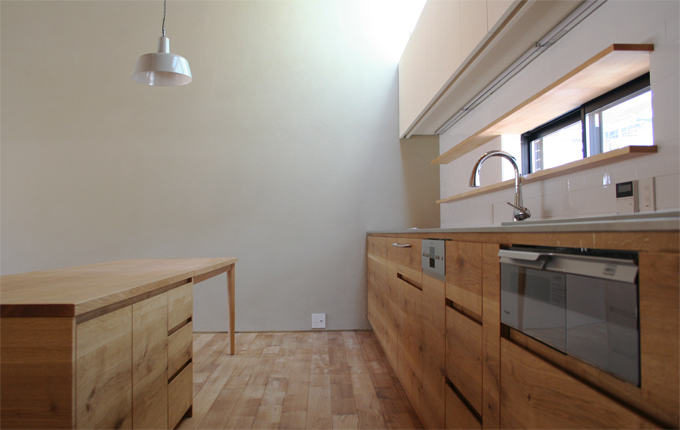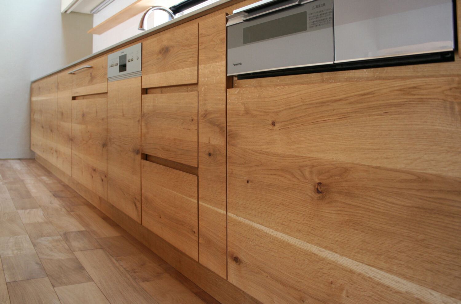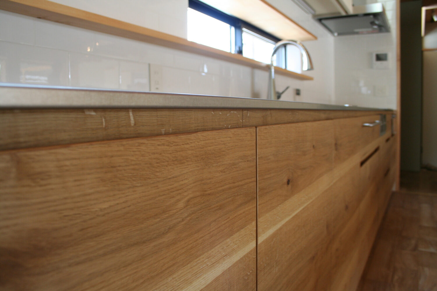 扉は白太をいれ、こぶしをいれたナラの突き板で製作、4700mmのステンレスカウンターは継ぎ目なしの1枚ものです。