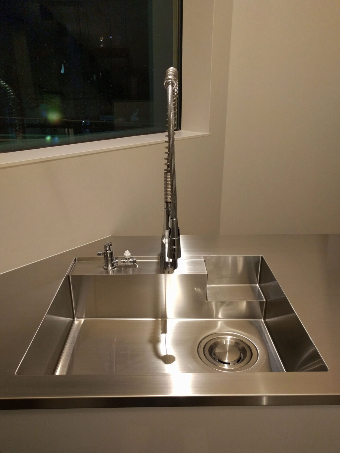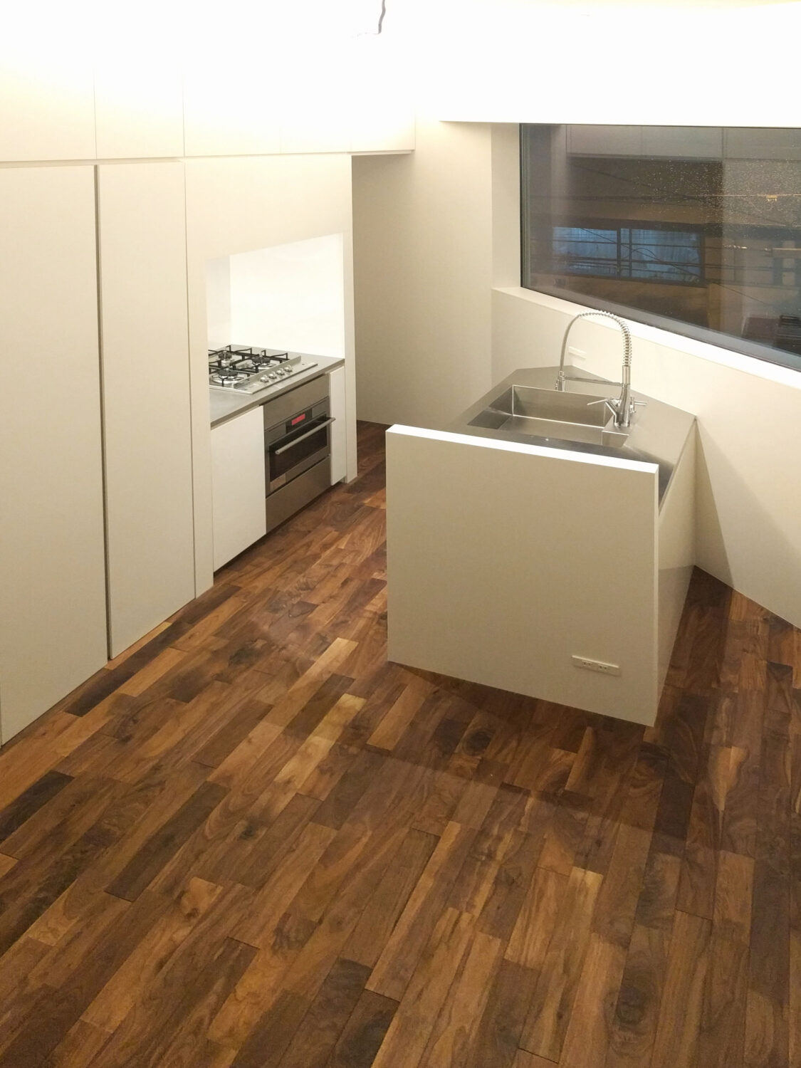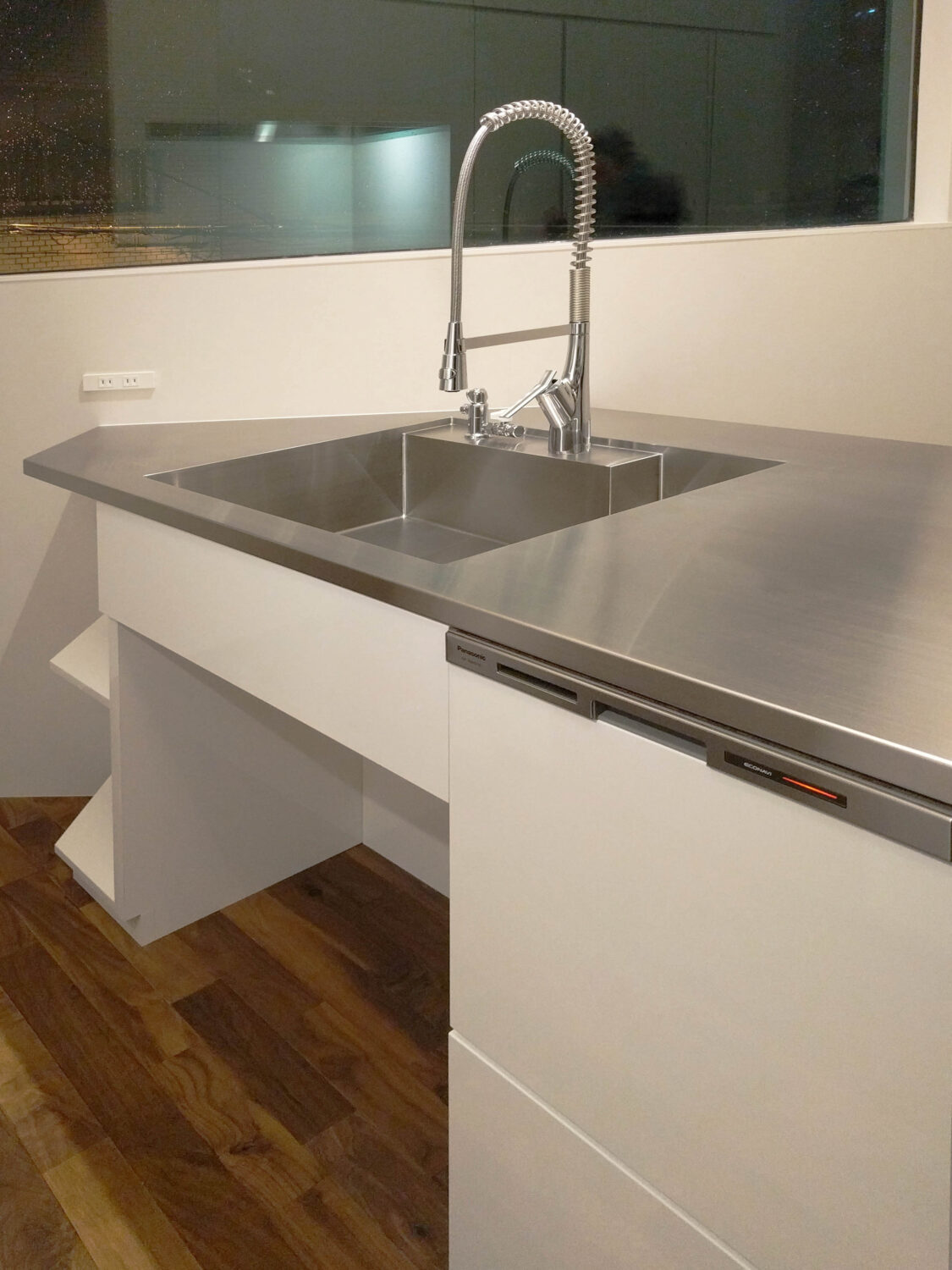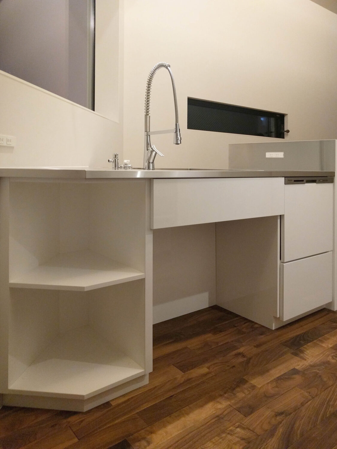 シンク側は斜めの外壁角度に合わせた形状で、シンク下部にゴミ箱スペースを設け、コンパクトなスペースに機能性とデザインにこだわったキッチンになりました。