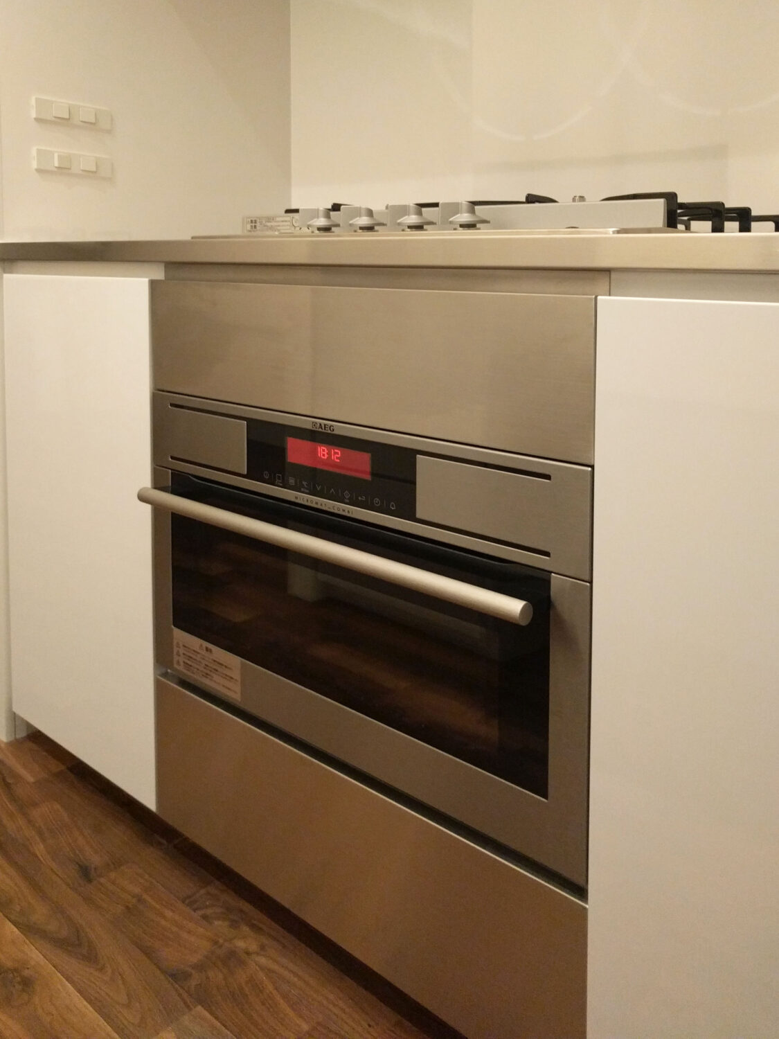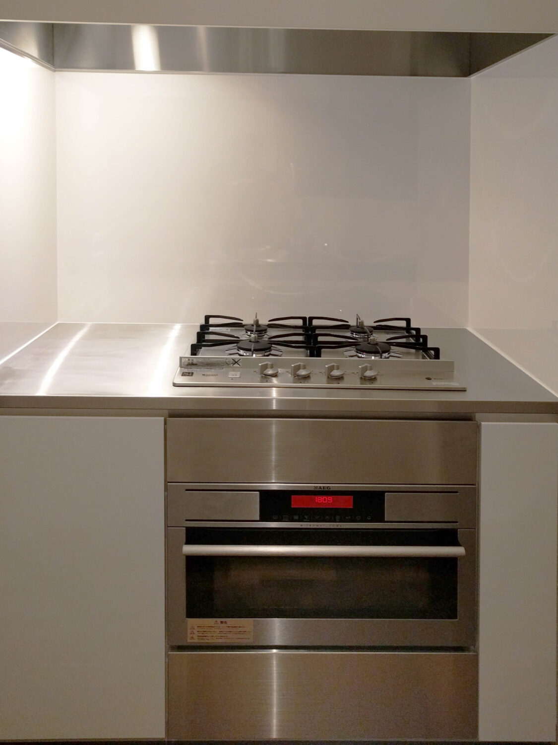 コンロ側は、4口ガスコンロ(グリルレス)とビルトイン電子レンジオーブンを搭載してスタイリッシュに仕上がりました。