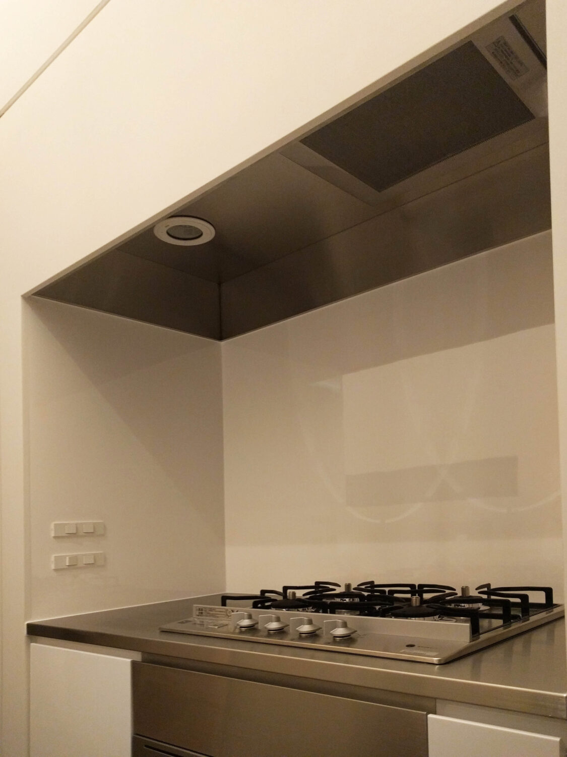 レンジフードは、ステンレスボックスと建築仕上材を組み合わせたオリジナル仕様で、壁面と前面がフラットに美しく収まりました。