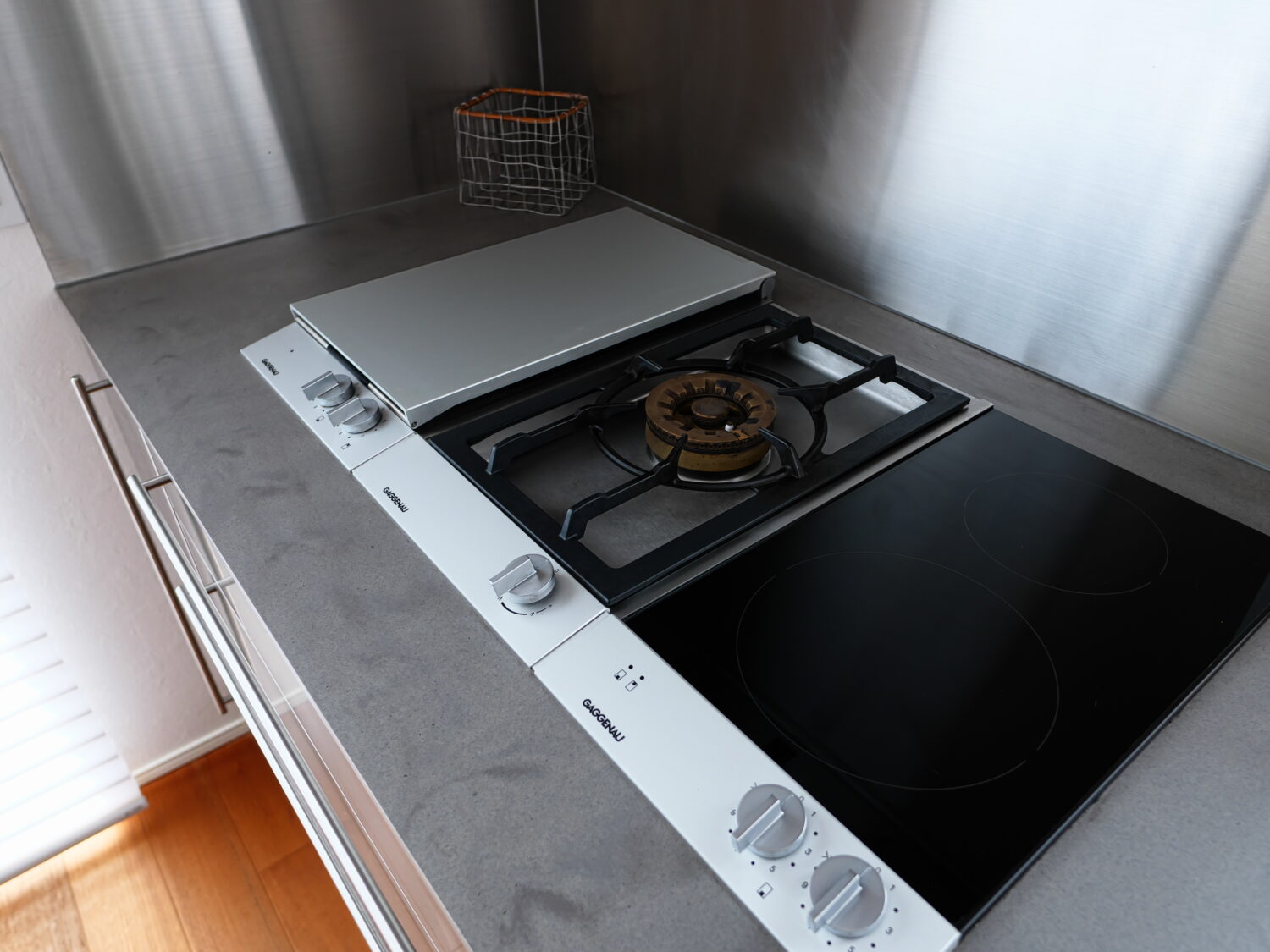機器はGAGGENAUのW600食洗機、IHコンロ、ハイカロリーバーナー、バーベキューグリル、レンジフードは加熱機器に合わせW1200の特注で製作しました。
