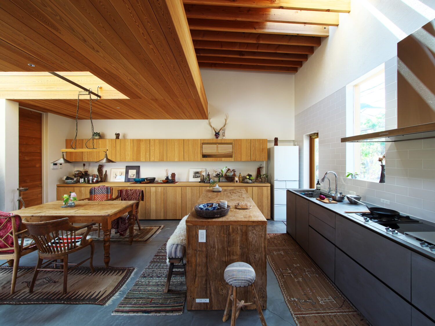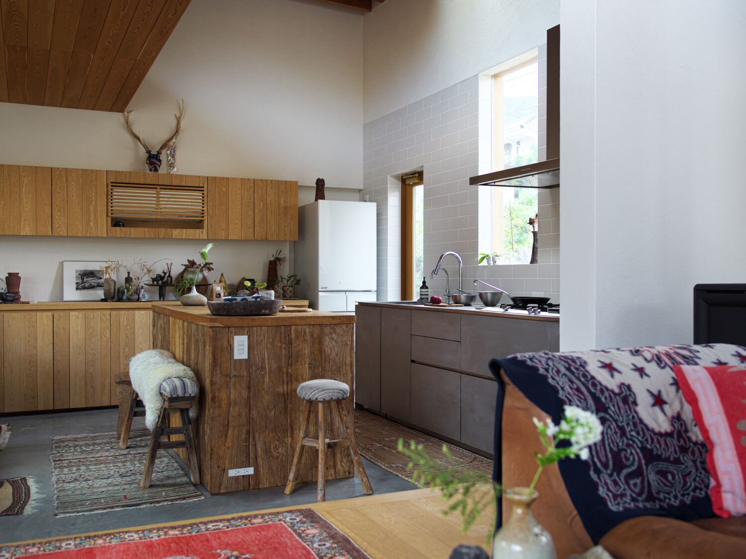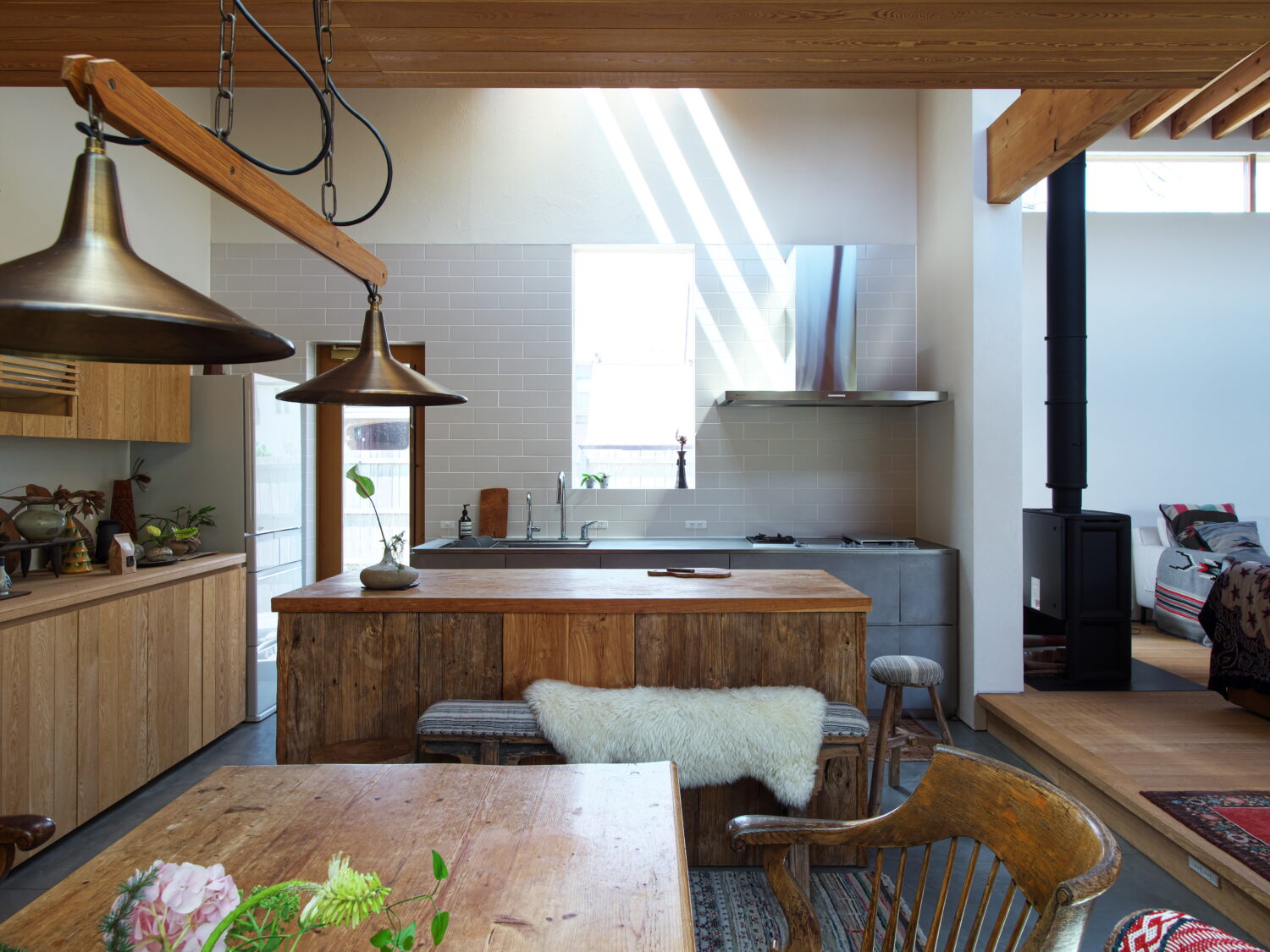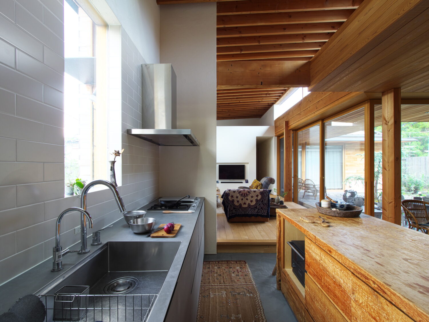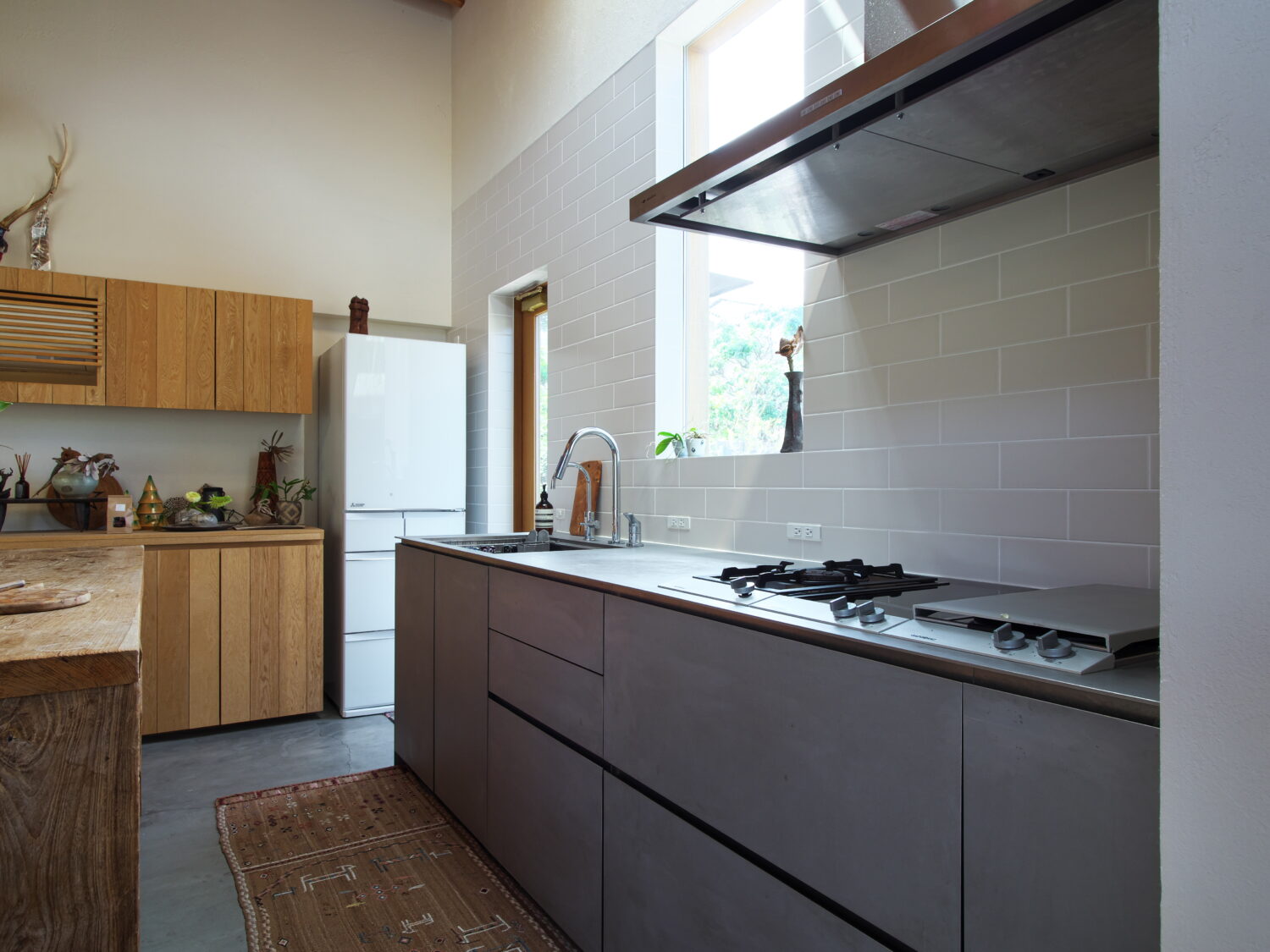 壁付けのシンプルなレイアウトのキッチンですが、ワークトップと扉を無垢のステンレスにしました。