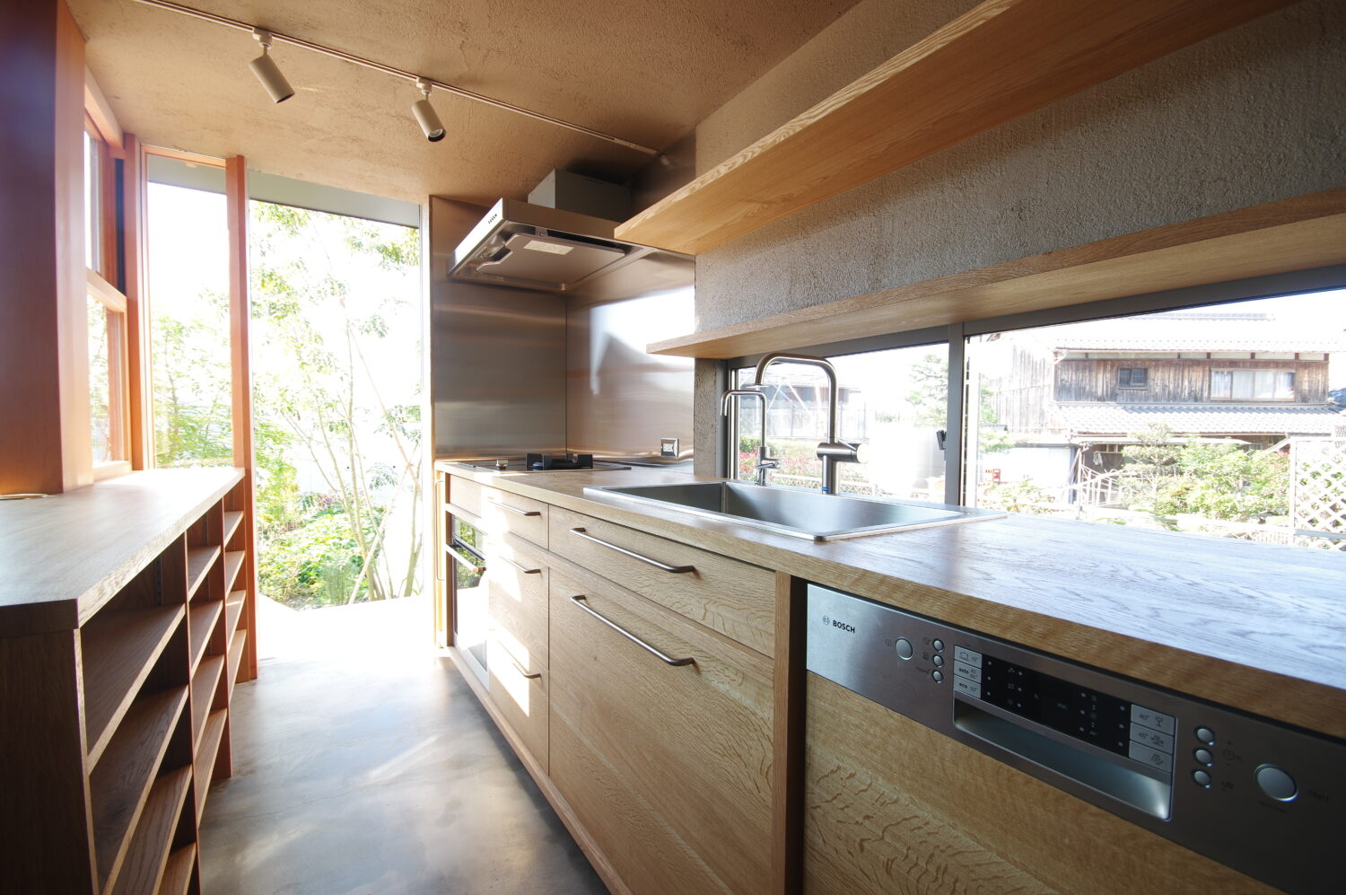 ワークトップは無垢のナラ、扉は白太とふしがはいったナラの突き板でつくりました。