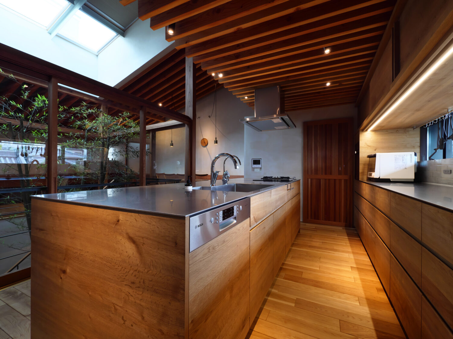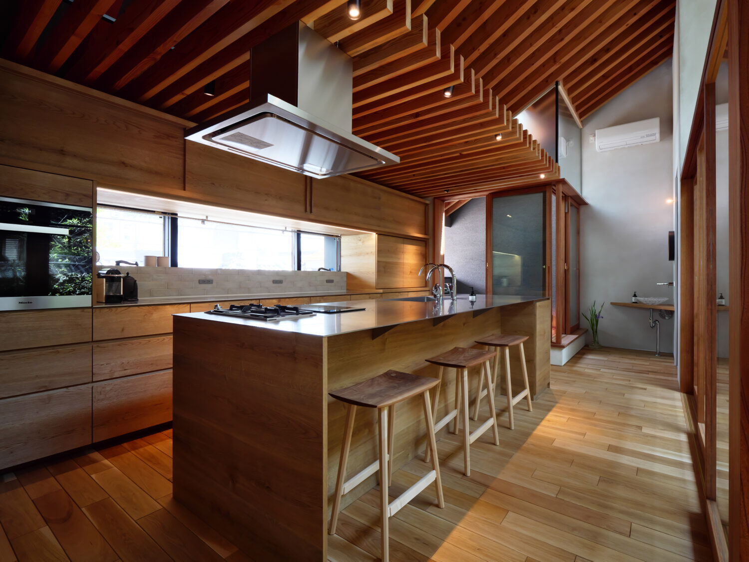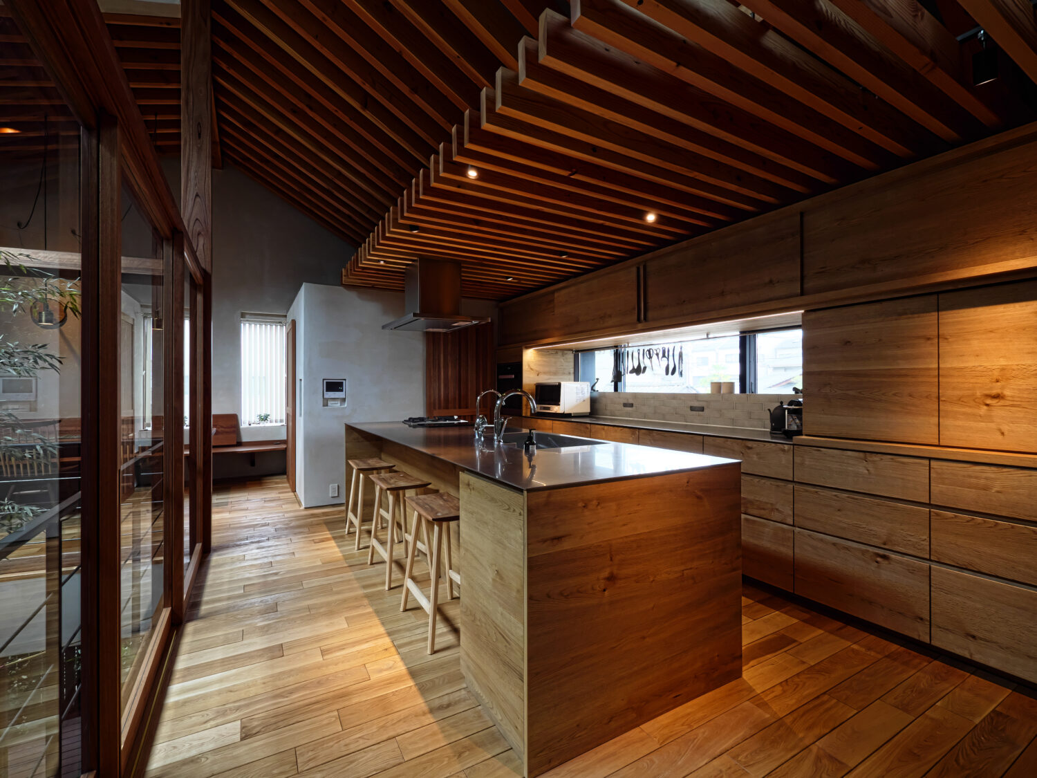 アイランドキッチンは中庭を眺めながらのレイアウト、対面側は椅子をおいて、Barカウンターとしてくつろげます。