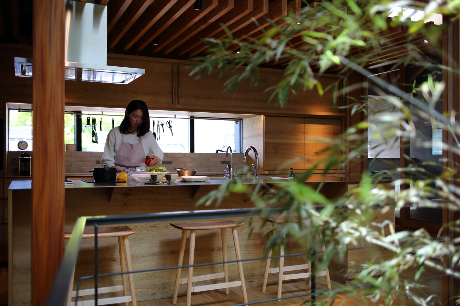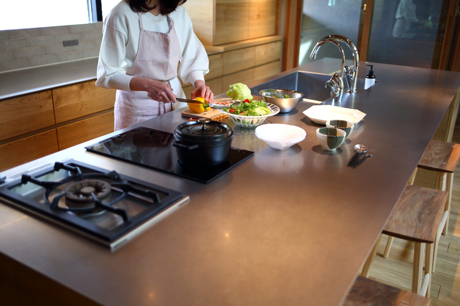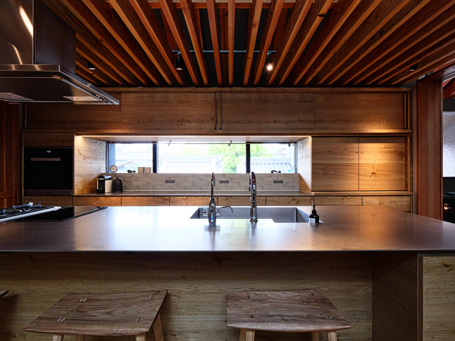 アイランドキッチンは中庭を眺めながらのレイアウト、対面側は椅子をおいて、Barカウンターとしてくつろげます。