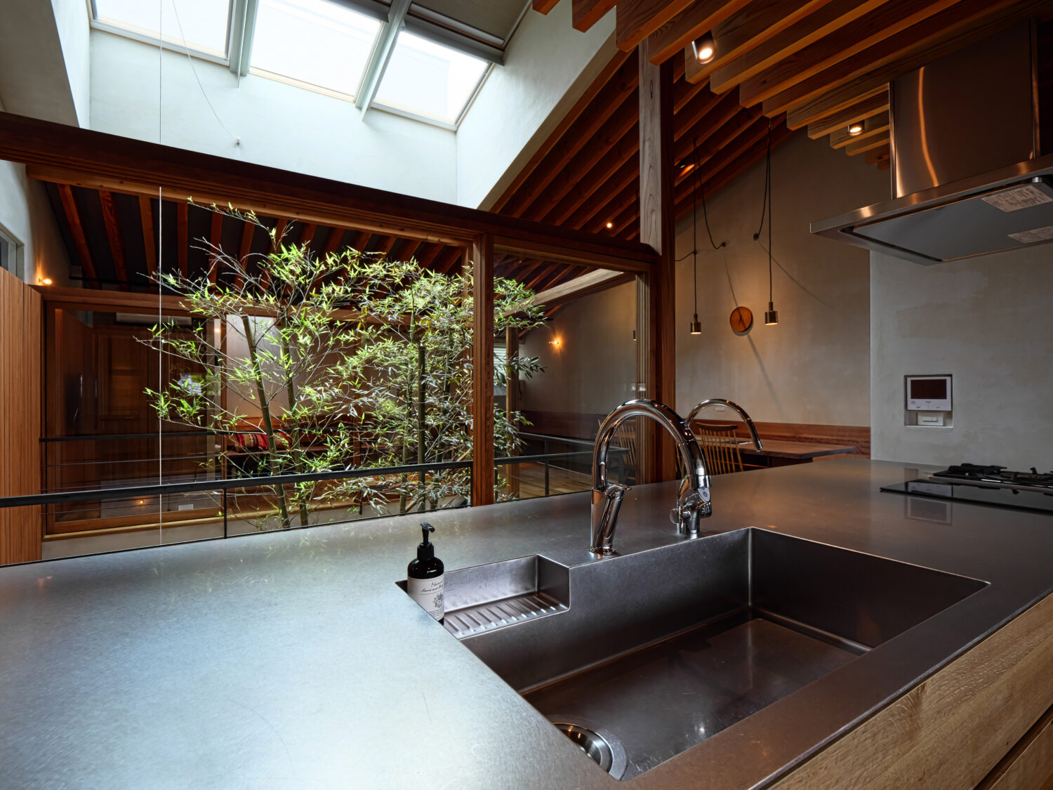 吹き抜けの庭を中心にキッチン、ダイニング、リビングが面しています。