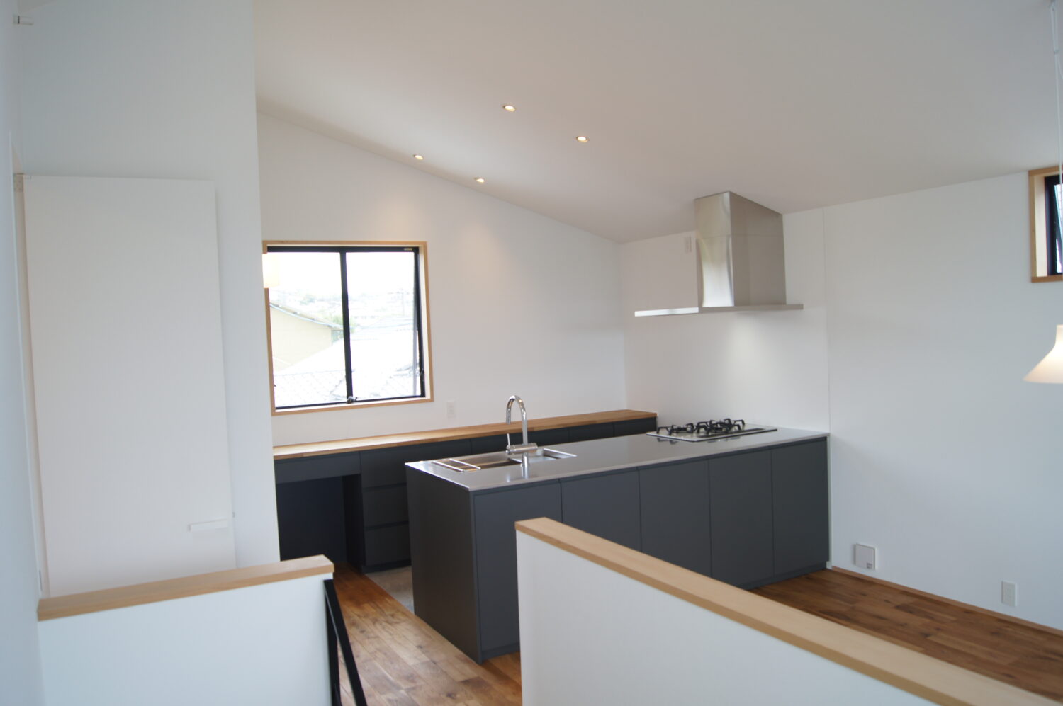 2階にあるキッチンに立ち リビング側を見ると 開放的で広がりのある眺望が美しく
