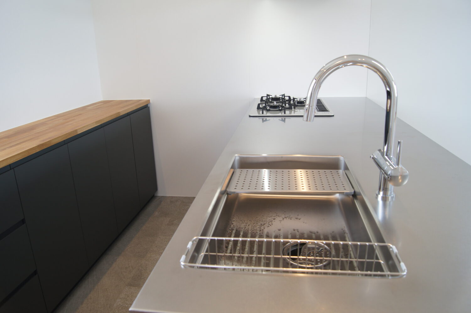 キッチン側のカウンターはステンレスのバイブレーション仕上げ、