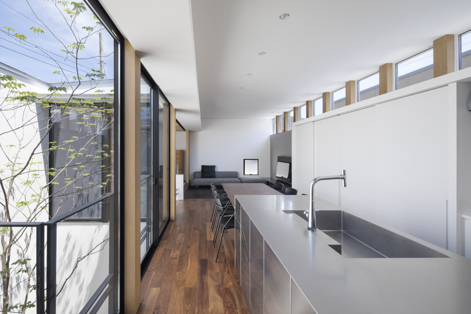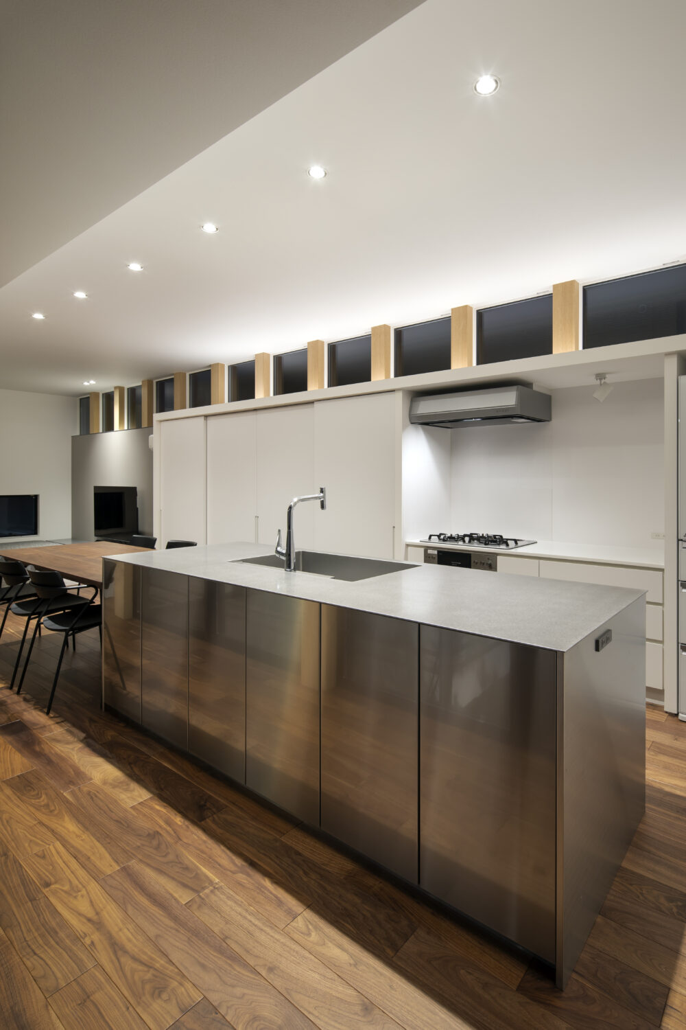 堺市の密集して建物が並ぶ地域に建つ二世帯住宅の子世帯のキッチンです。