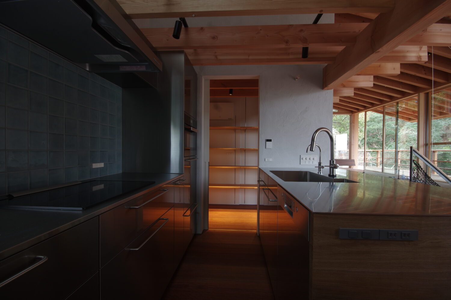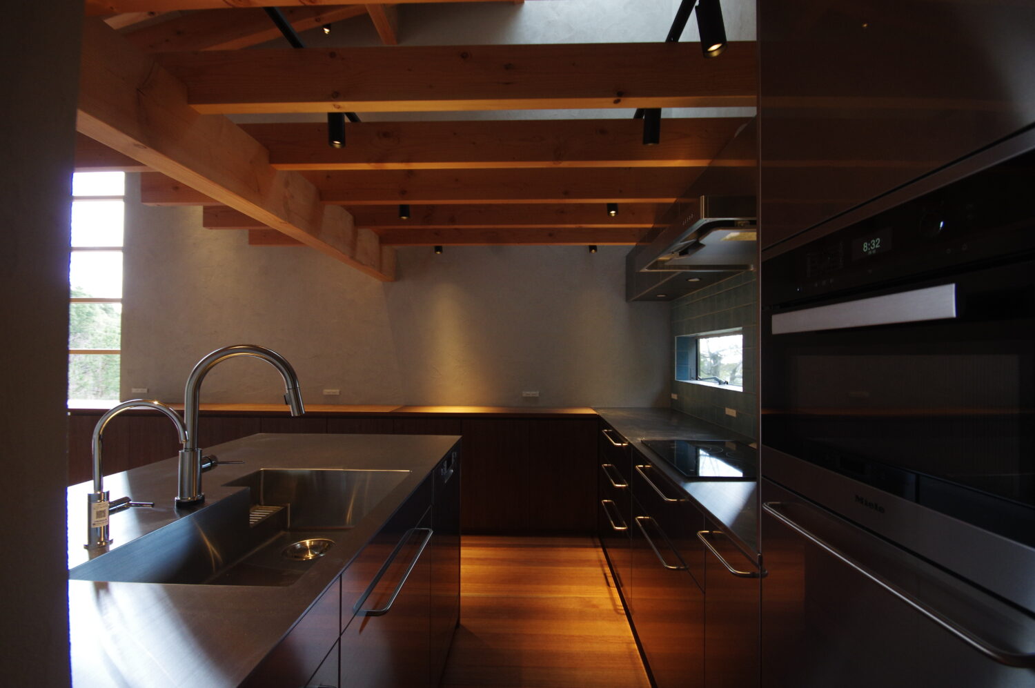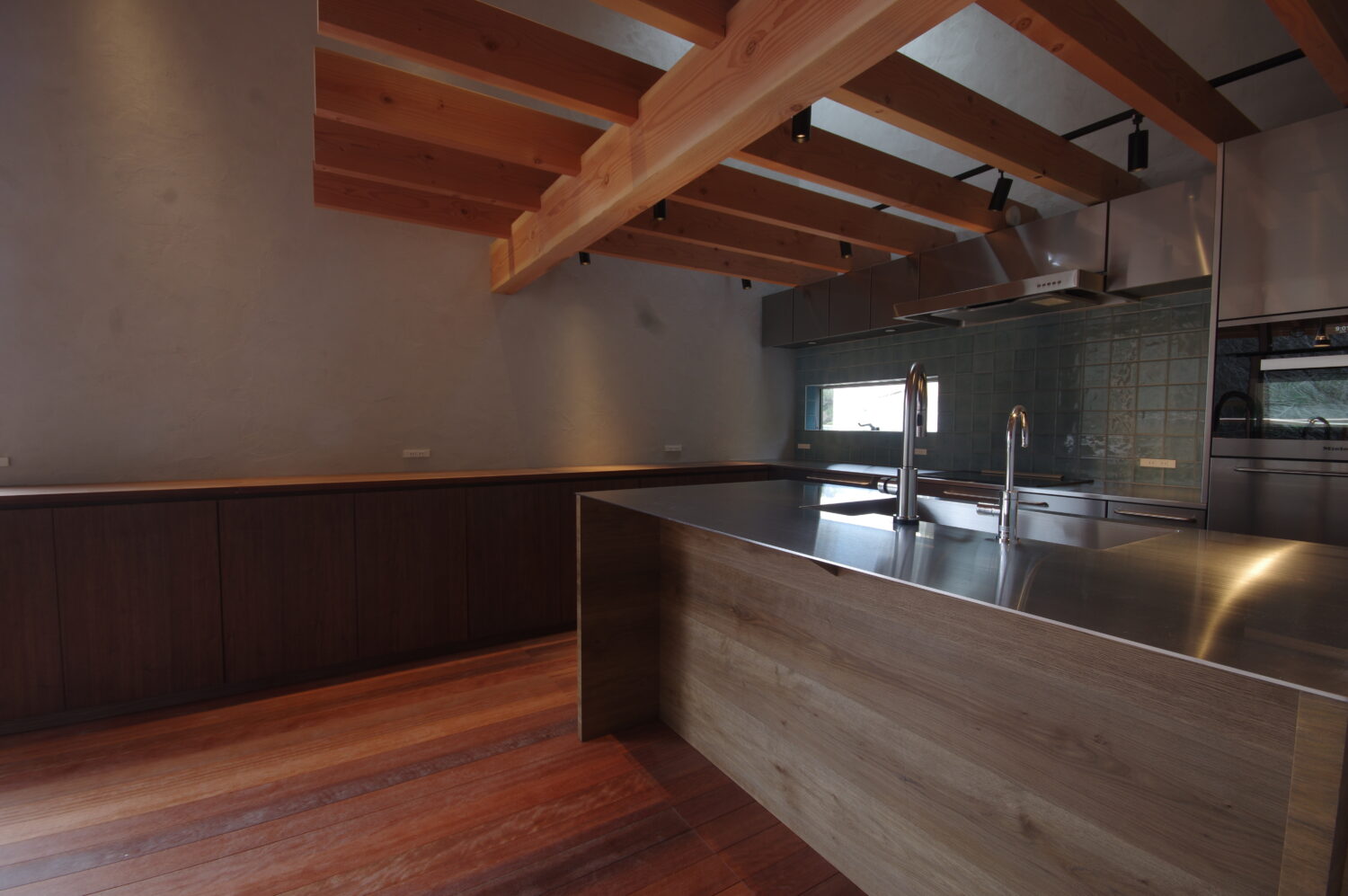 キッチン本体はシャープで機能的なステンレスで製作をしました。リビング・ダイニングから見えるアイランドワークトップは5㎜のステンレス無垢、対面部分は節と白太をいれたグレイッシュなナラは建築部分の木とキッチンのステンレスの素材をきれいにつなげています。