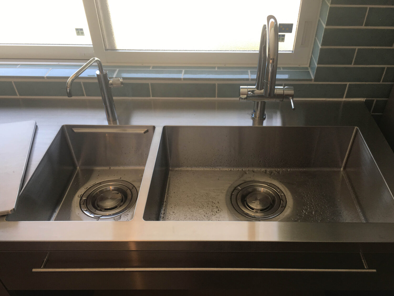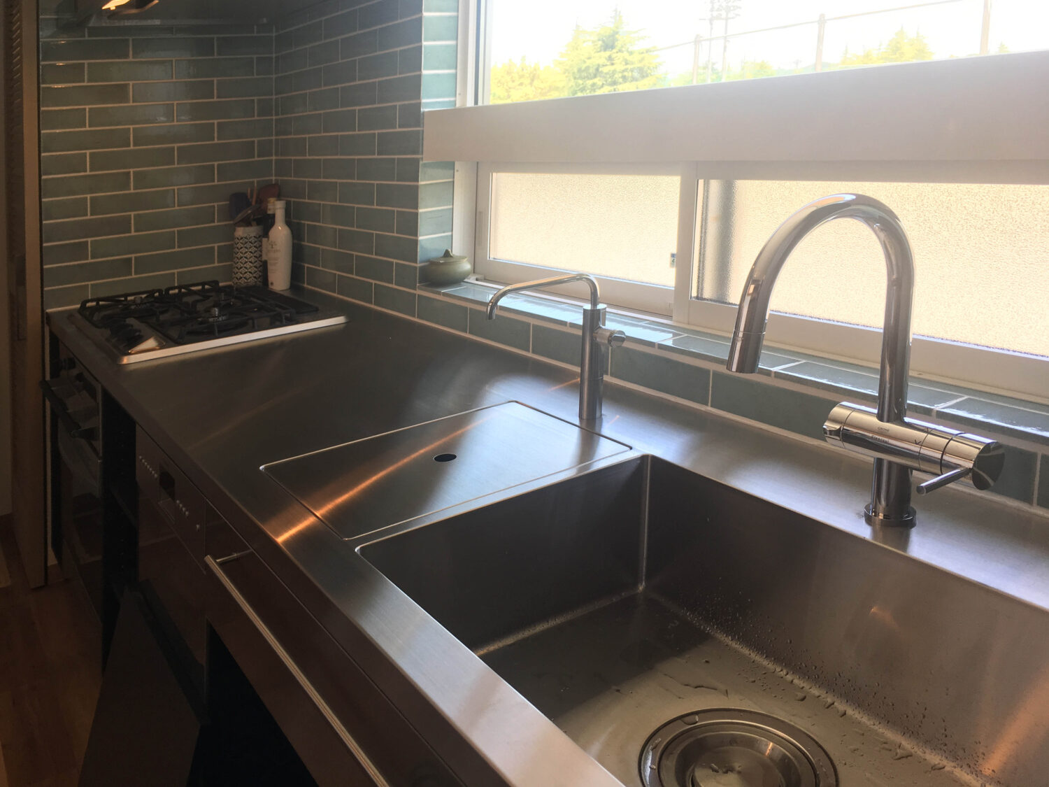 オーダーで製作したダブルシンクは片方を使わない時には蓋をしてワークトップとしてつかえます。