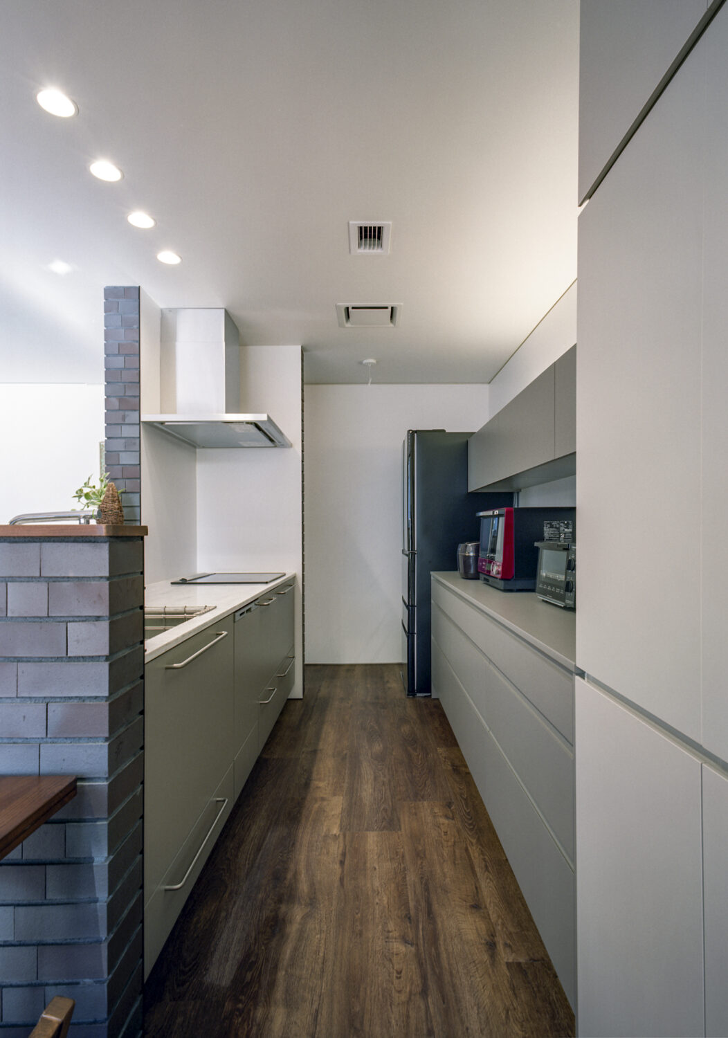 1階キッチンはレイアウトは見た目と使い勝手ともにシンプルで、機器はIHのグリルレス・レンジフードのフィルターレスと、機能的なものをスペックしています。