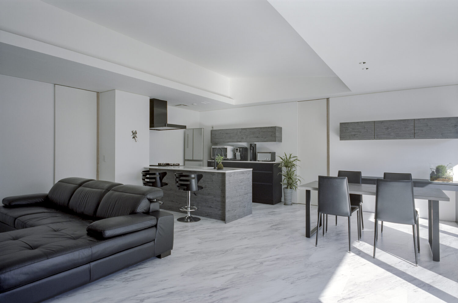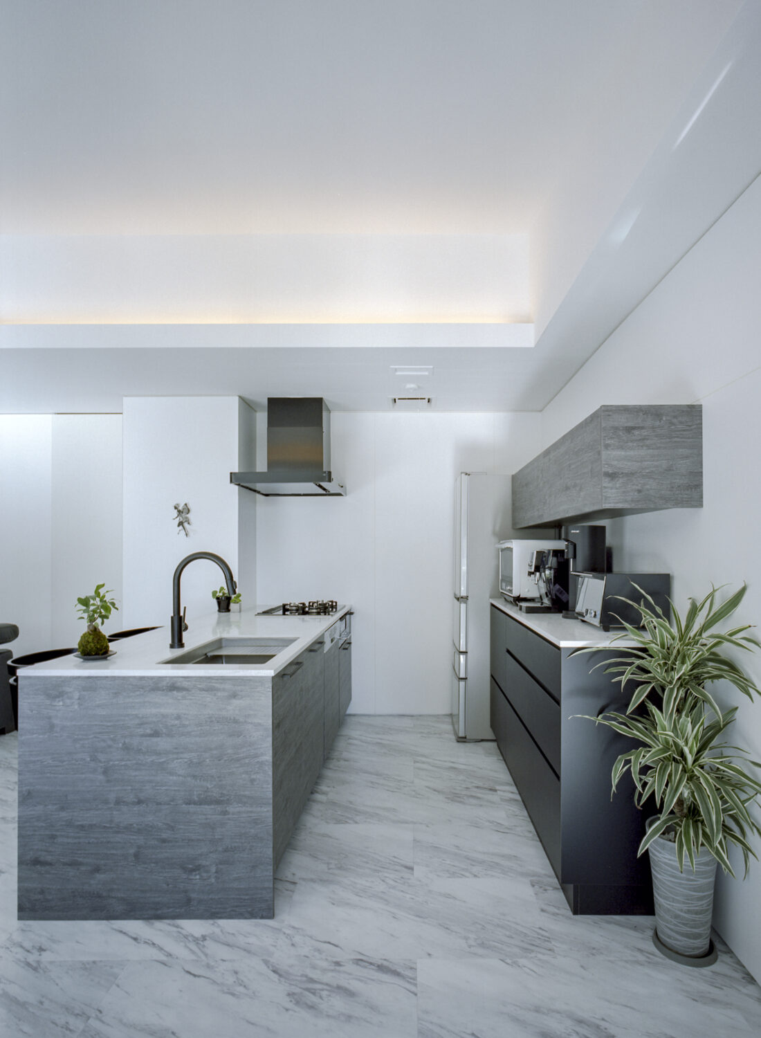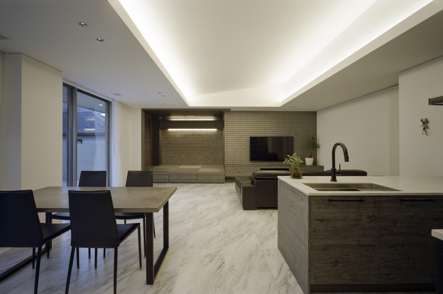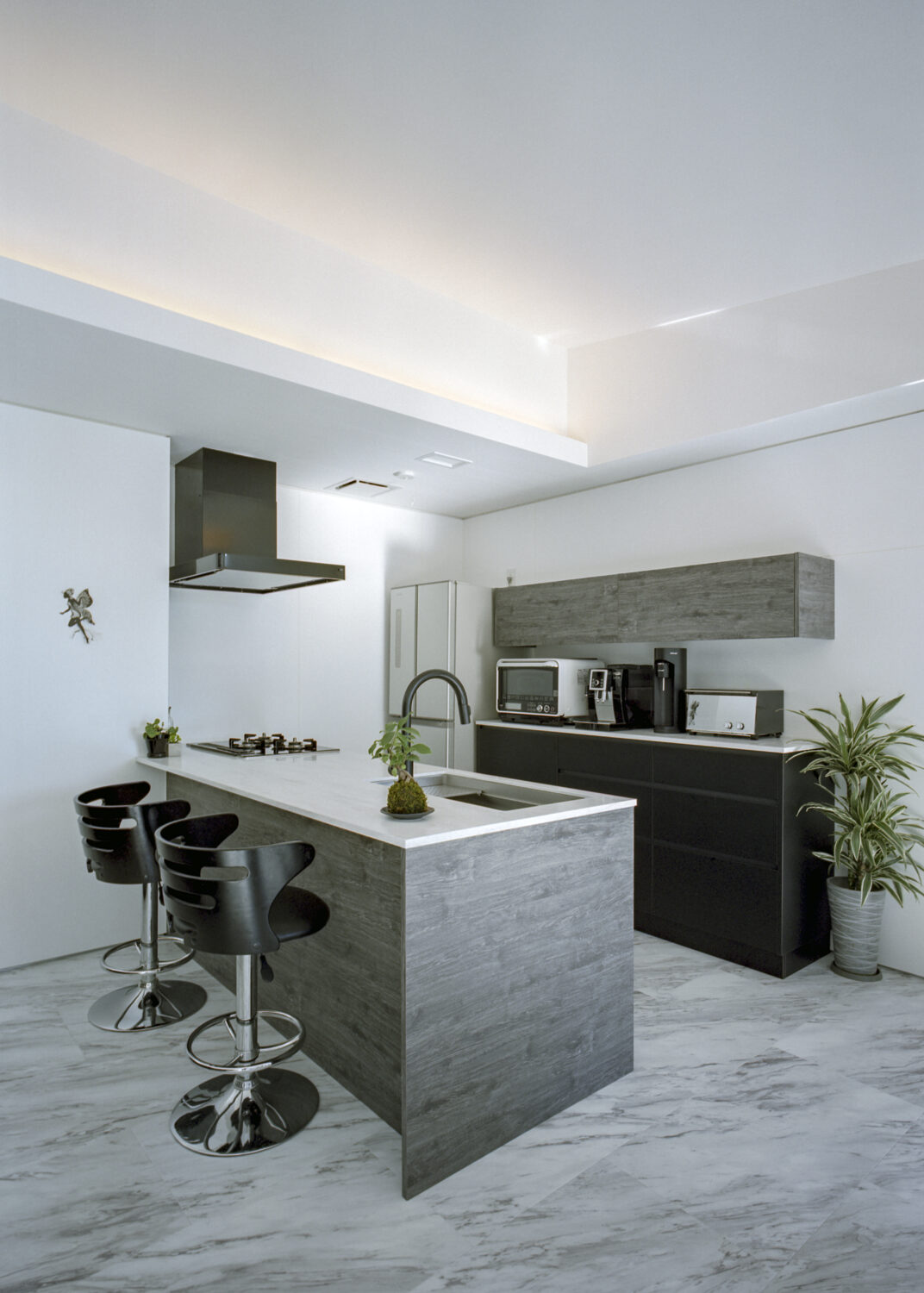 2階はお手入れのしやすさとダーク系カラーを表現できるメラミン扉、水栓やレンジフード・取っ手等ブラックで統一し、クールで締まった印象です。