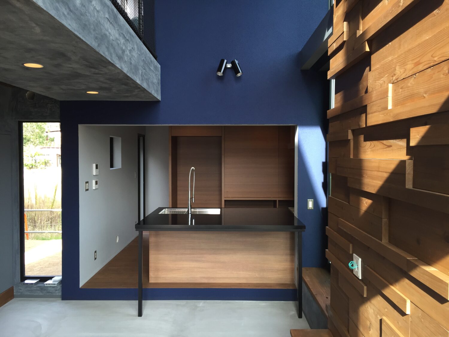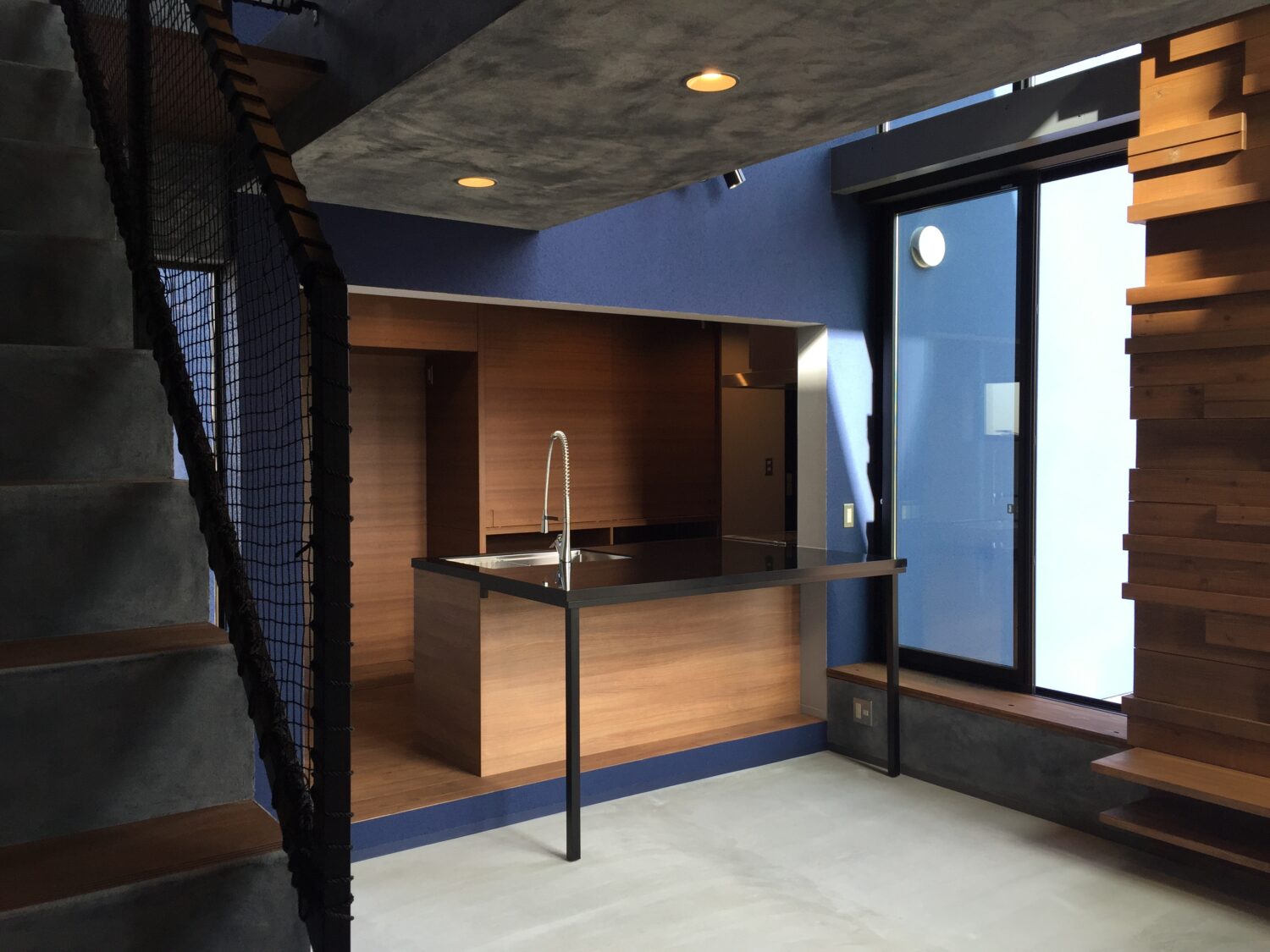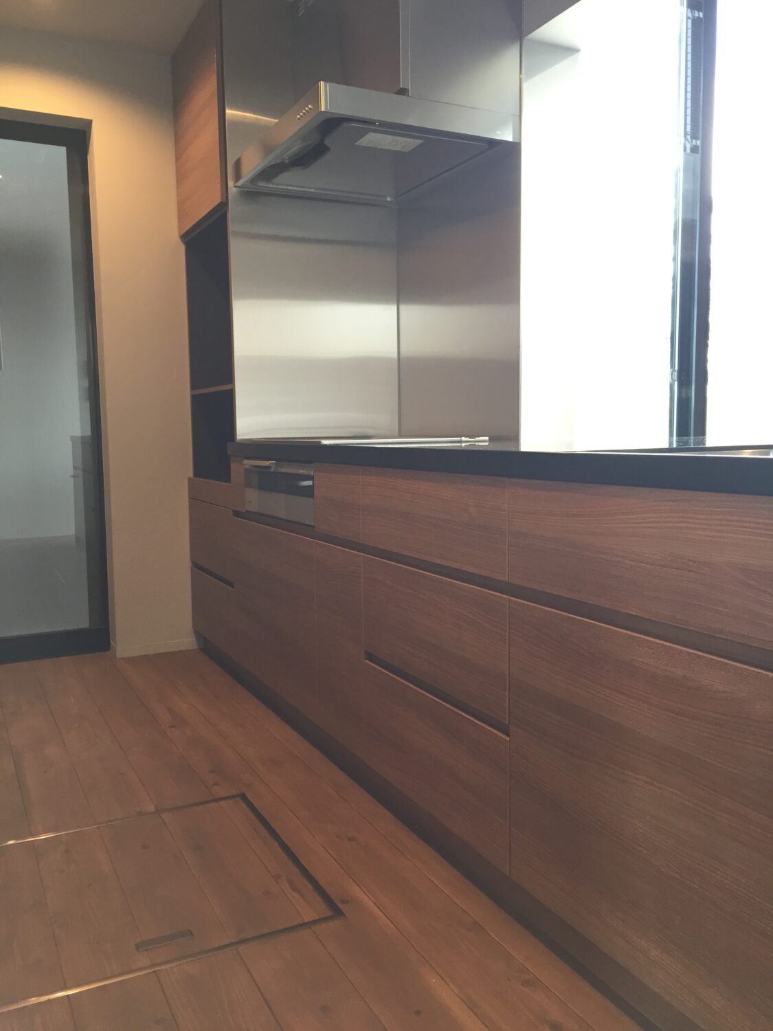 扉は背面の収納と合わせた木目にして空間になじんでいながらも、カウンターと脚は格好よくシックに黒でまとめ、特注シンクと水栓金具の個性が際立っています。レンジフードとコンロ周りは機能的にステンレ製、コンロ奥の収納は家電が収納ができるように製作しました。