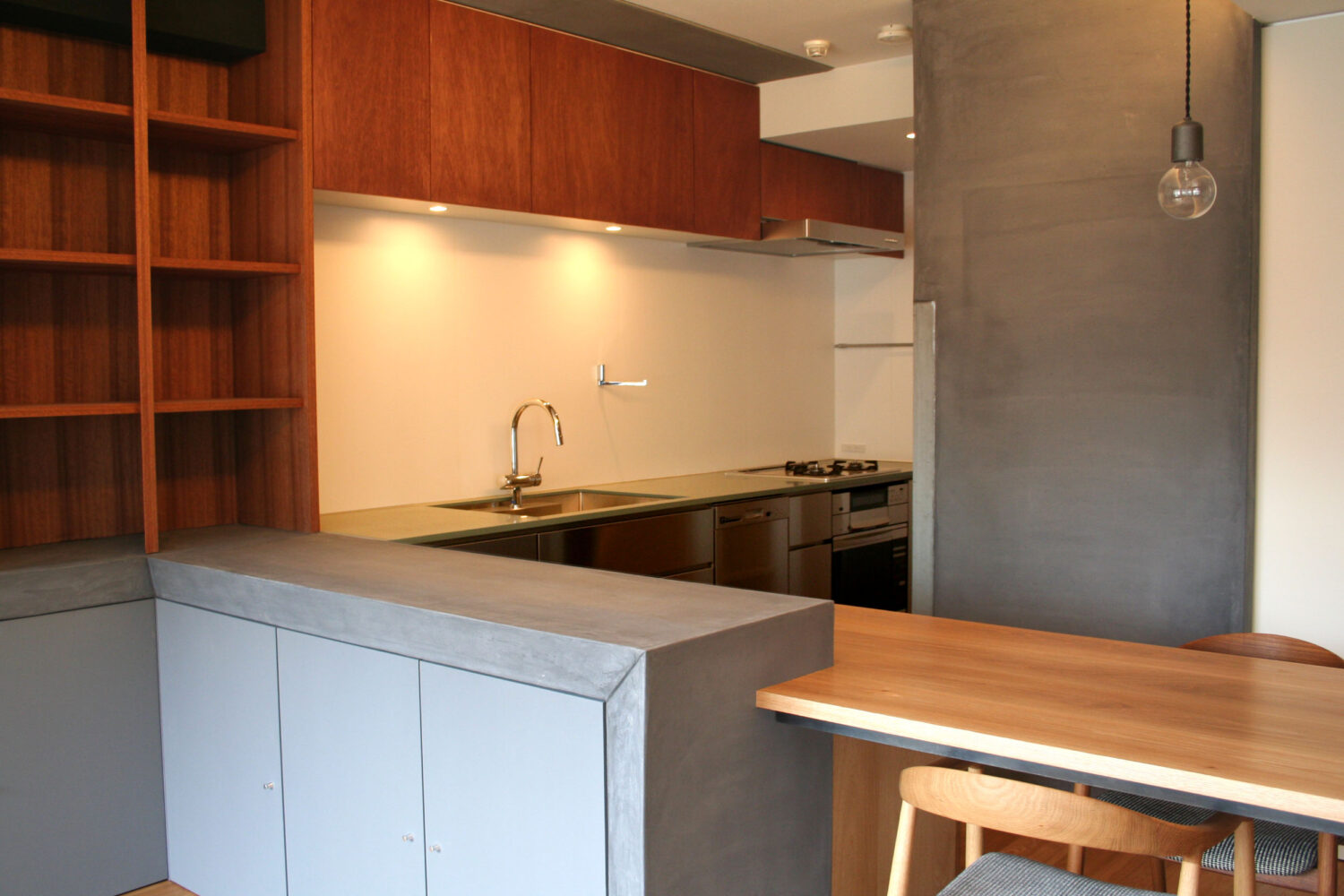 マンションのフルリノベーションのためのキッチンです。LDKが出来るだけ広く感じられるように、キッチンは背面のI型タイプとしました。ダイニングテーブルからキッチンへの動線をL字型にすることで、調理・盛付・配膳がスムーズに行えるようにしています。