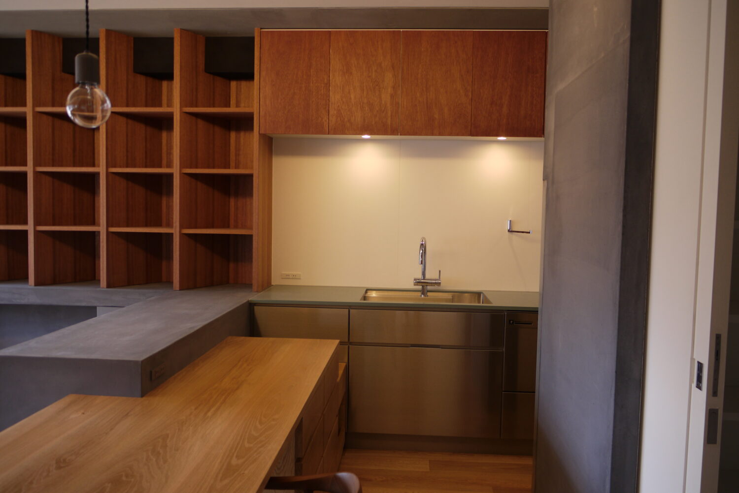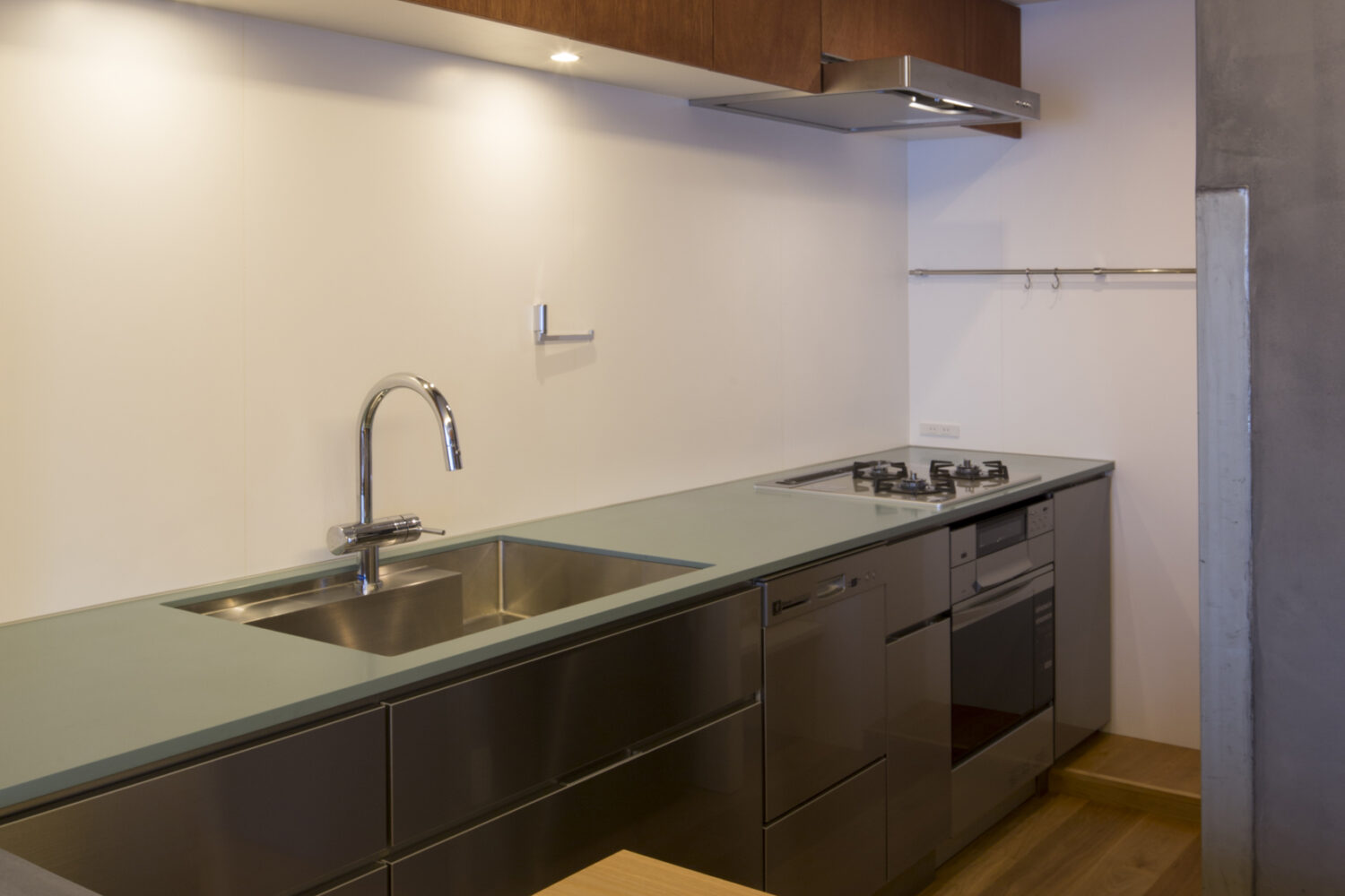 全体のインテリアとのバランスやメンテナンス性を考慮し、キッチンの面材はステンレス、天板は青みあるグレーの人大としました。天板のエッジや収納の手掛けは横のラインを強調するミニマルなディテールとし、キッチンをインテリアの一部として調和させ、さりげなくも凛とした存在感をもたせています。