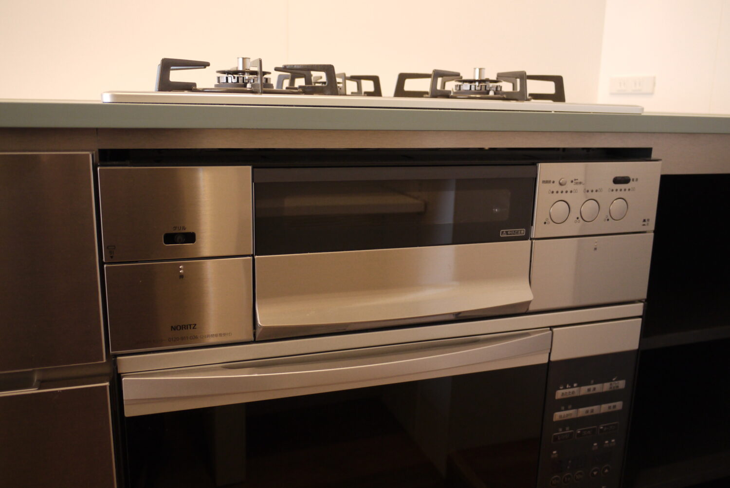 また、シンクとコンロの両サイドを引出しや開き扉の収納とし、収納力と作業効率を高めています。