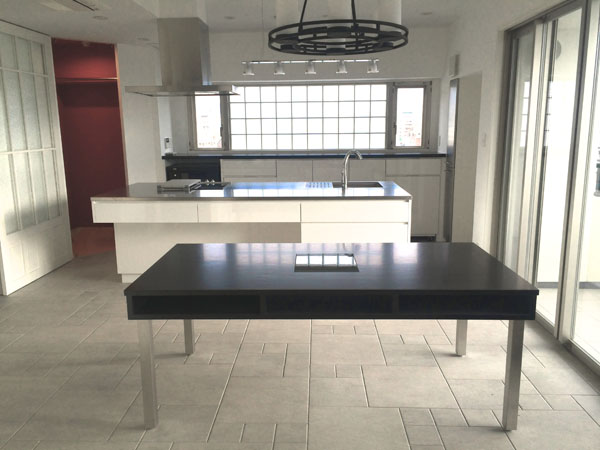 特注のダイニングテーブルの真ん中にはお鍋ができるよう、IHを仕込みました。黒のバイブレーション仕上げとモノトーンでまとめ、キッチンのカウンターはステンレスのバイブレーション仕上げ、洗練された雰囲気を漂わせた大人の空間のキッチンになりました。