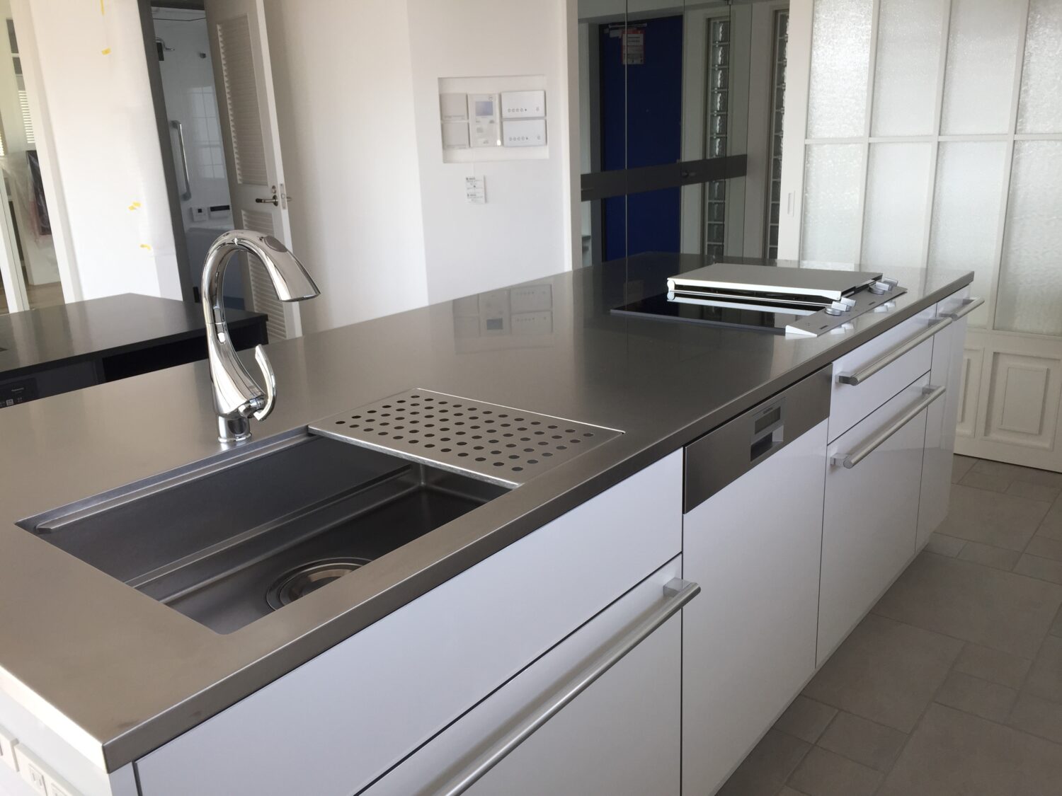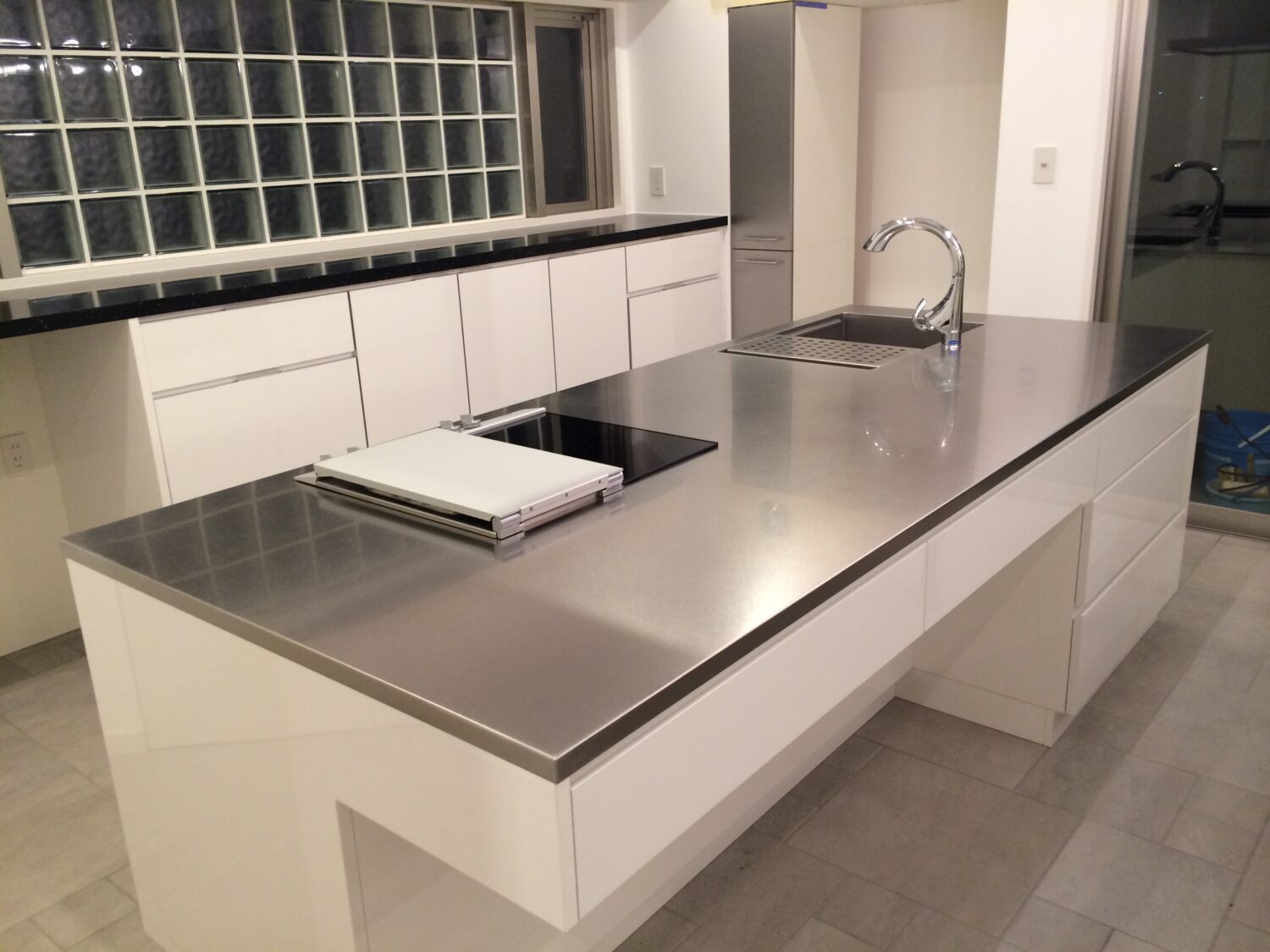 特注のダイニングテーブルの真ん中にはお鍋ができるよう、IHを仕込みました。黒のバイブレーション仕上げとモノトーンでまとめ、キッチンのカウンターはステンレスのバイブレーション仕上げ、洗練された雰囲気を漂わせた大人の空間のキッチンになりました。