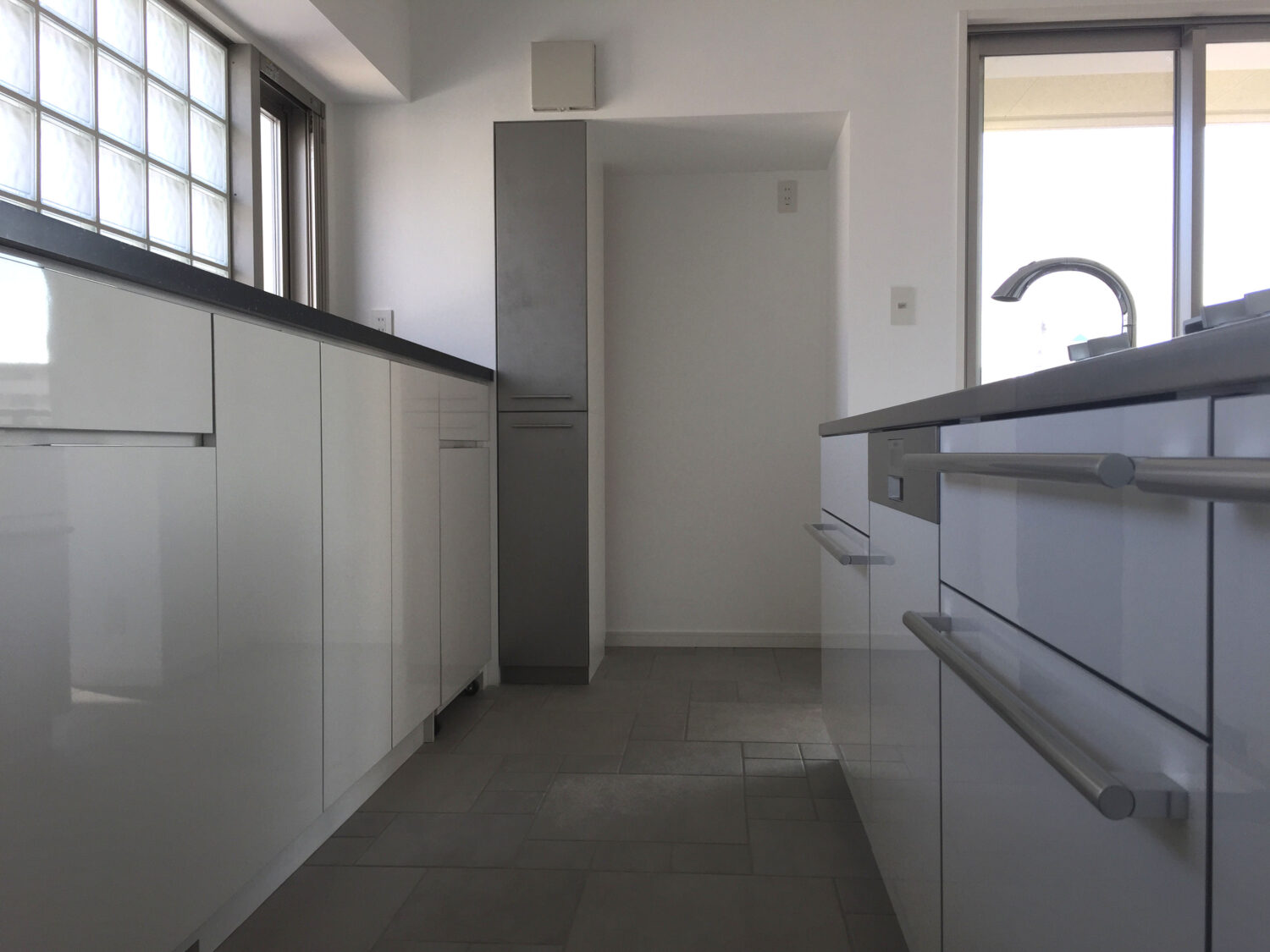 扉は白の鏡面にしてエレガントでありな扉のエッジをアルミとシャープに仕上げ、沢山の食器や家電が収納できるよう背面収納を製作しました。