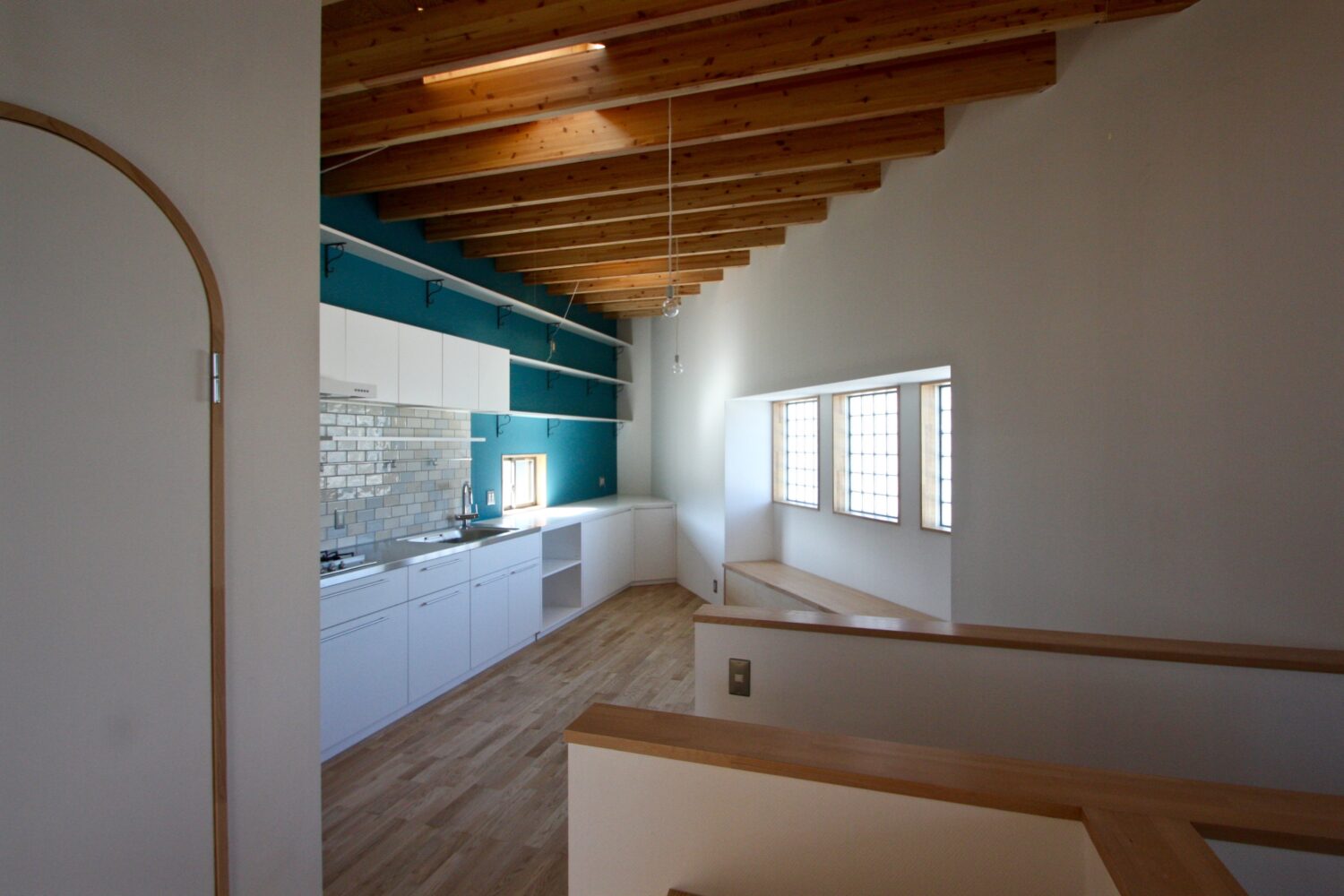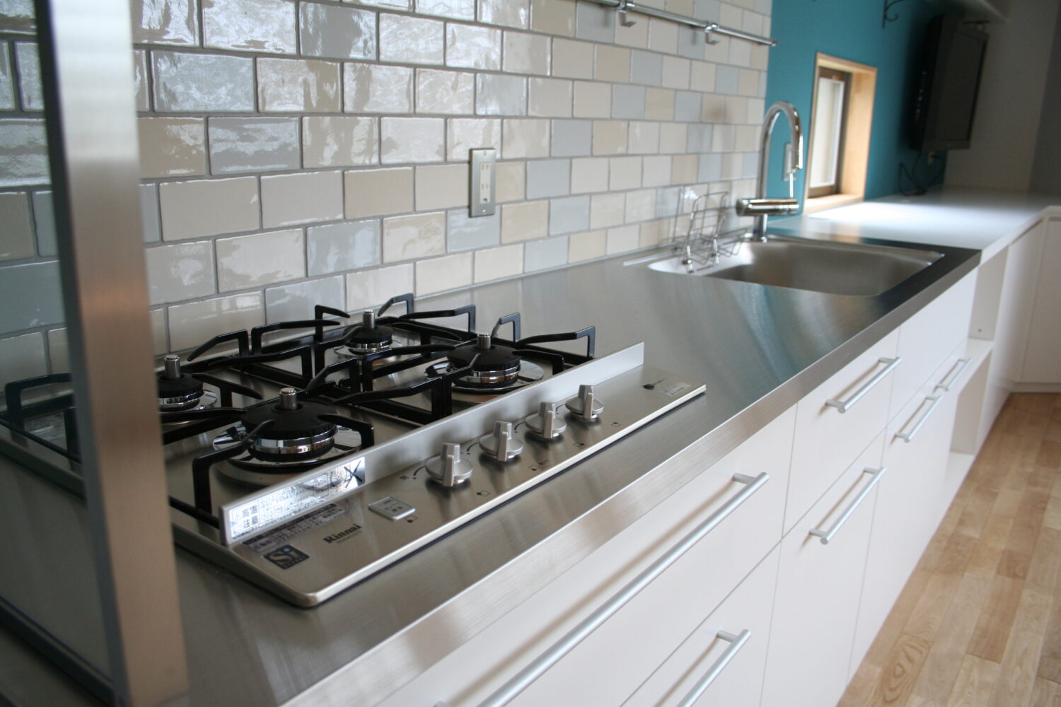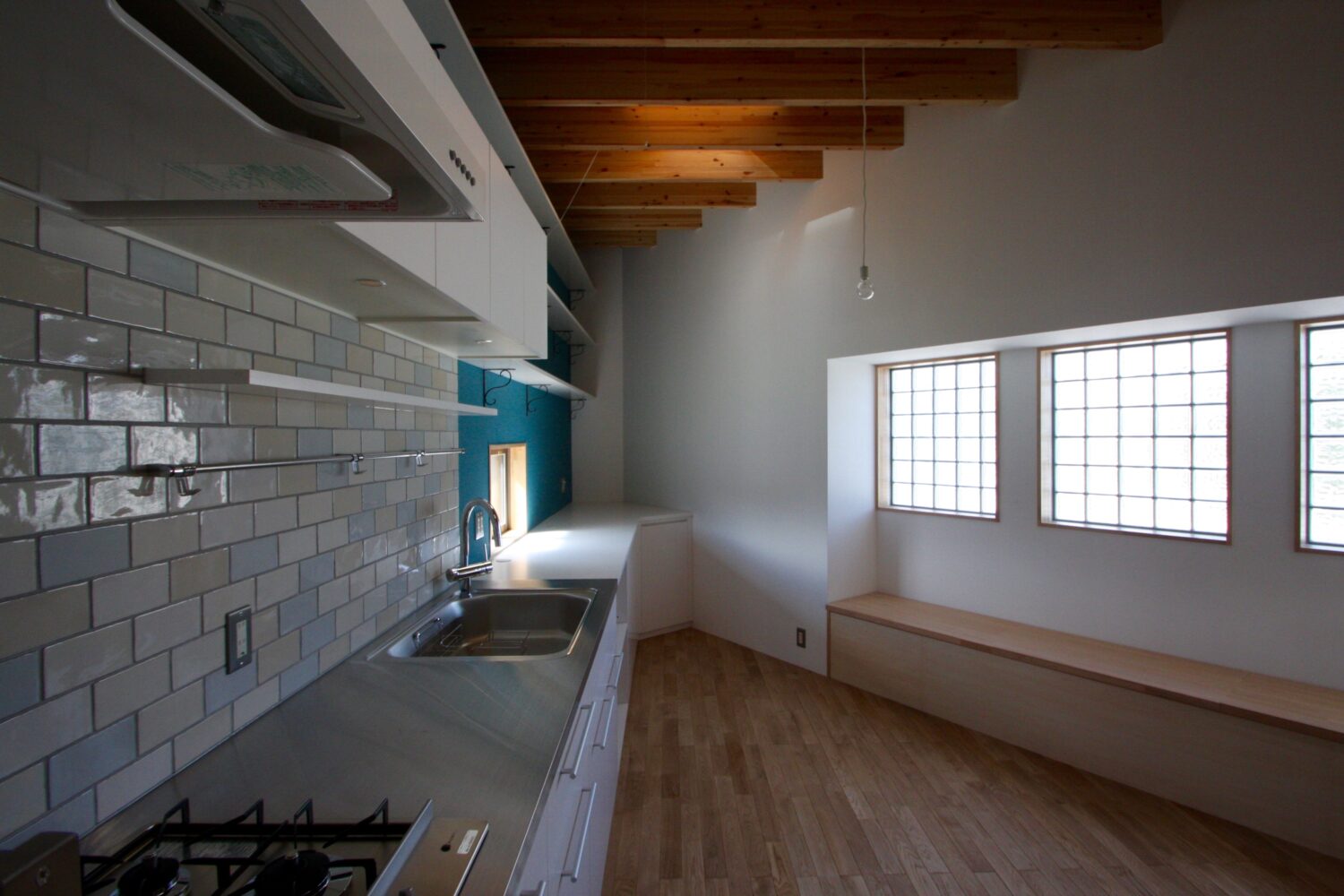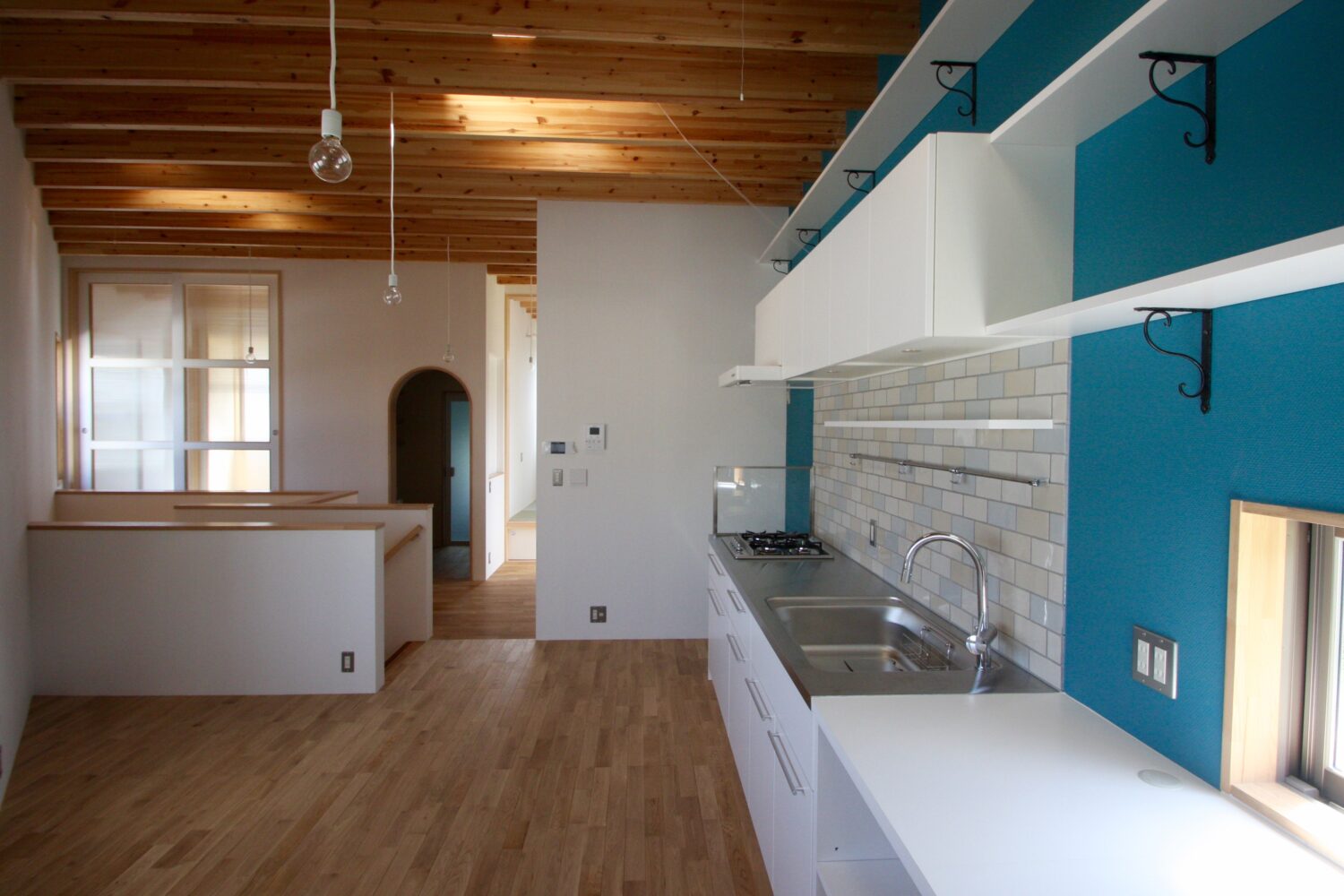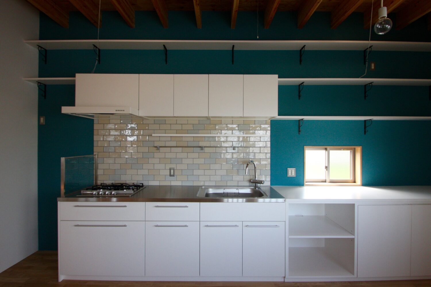 壁一面にしつらえたキッチンと棚板は家具のように扱い、